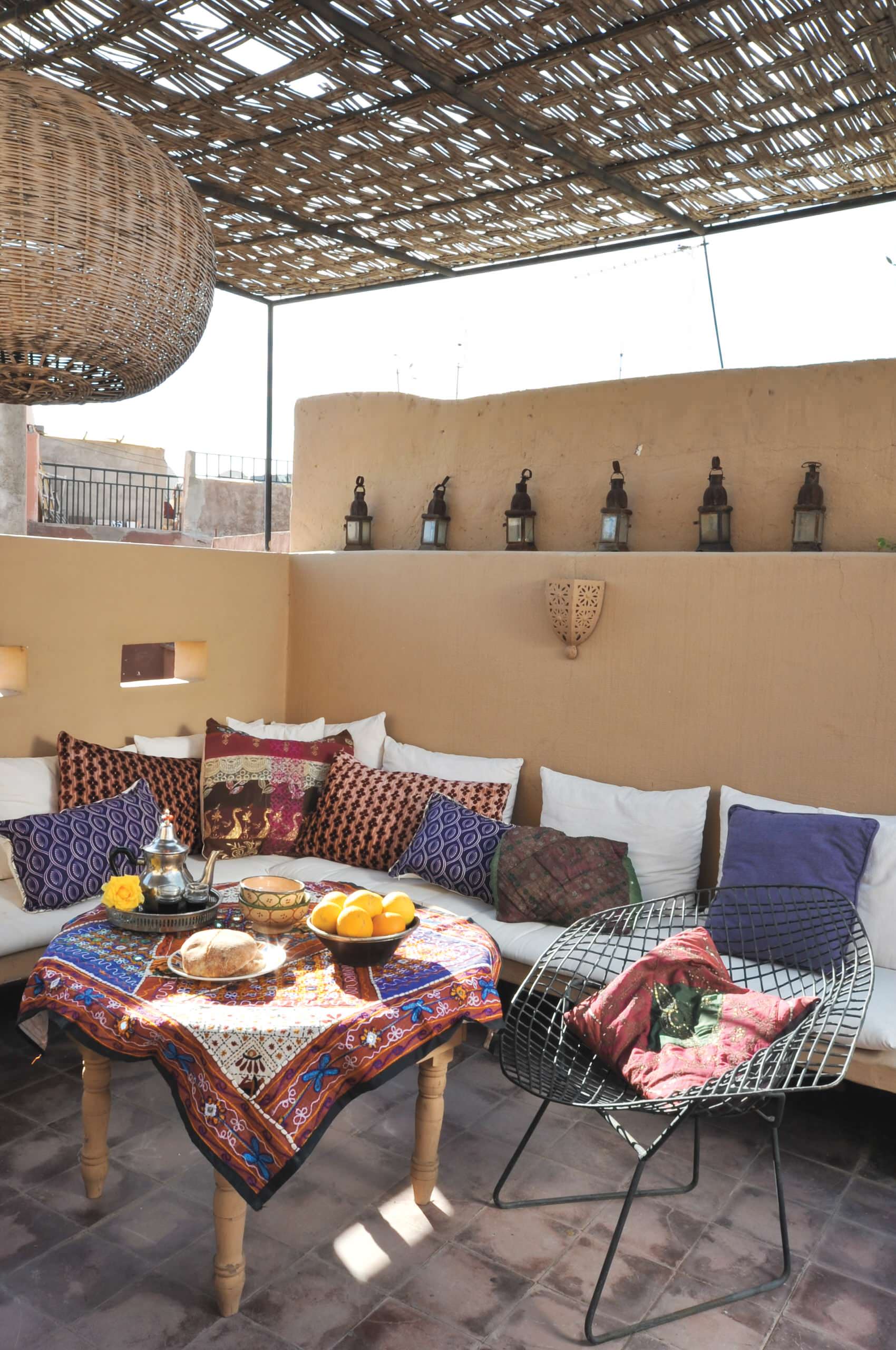 Sie müssen nicht unbedingt nach Marokko ziehen, um sich ein bisschen südländisches Flair auf den Balkon zu holen. Ein Sonnendach aus Bast oder Bambus und viele (und noch mehr) bunt zusammengewürfelte Kissen auf einer langen Sitzbank tun es auch. Mit einer Handvoll marokkanischer Laternen aus Eisen verwandeln Sie Ihre Wohlfühloase nach Sonnenuntergang in ein orientalisches Märchen aus 1001 Nacht.
