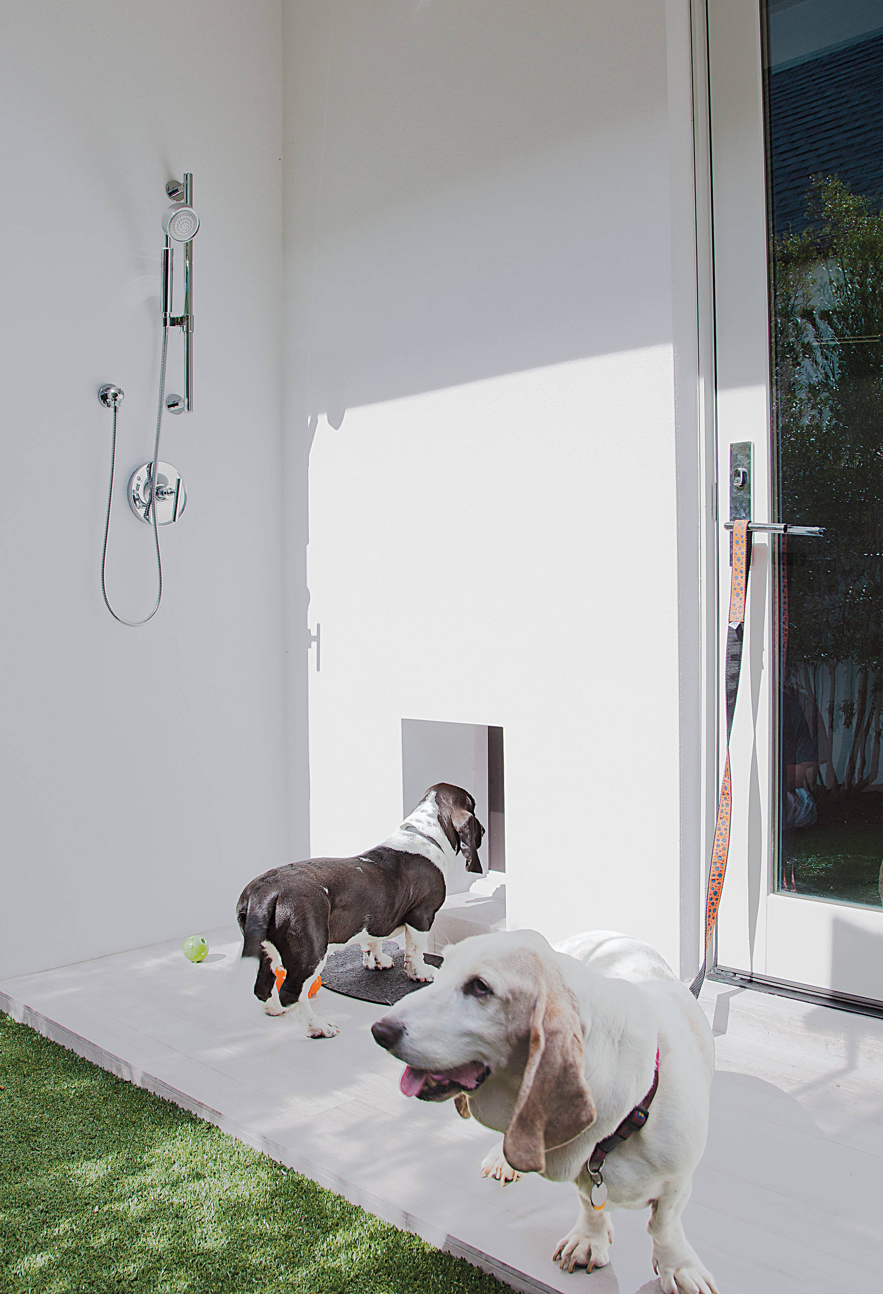 Damit sie nicht jedes Mal den halben Garten an den Pfoten mit rein bringen, liegt eine Pfotenmatte zum Abstreifen bereit. Und falls es eine Schlammschlacht gab – greift der Hundebesitzer vor dem Reingehen einfach kurz zur Dusche.