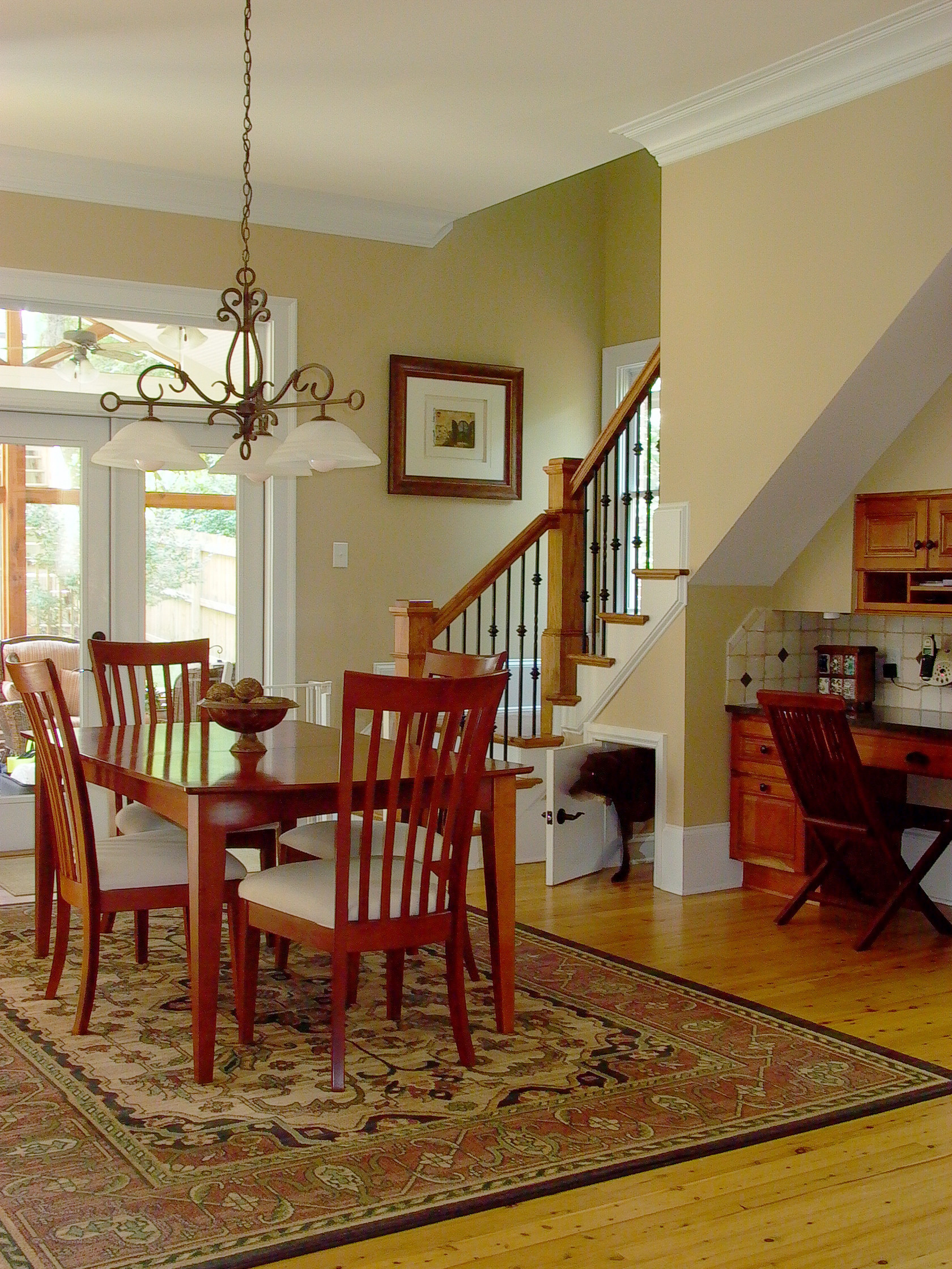 Wohnzimmer die Zweite: na, haben Sie den Vierbeiner entdeckt? Raffinierte Einbauten wie hier unter der Treppe bieten dem Hund ein tolles Versteck, in dem er sich rundum geborgen und sicher fühlt. In unmittelbarer Nähe zum Tisch hat er trotzdem noch einen guten Blick auf das Geschehen. Süß: die eigene kleine Tür.