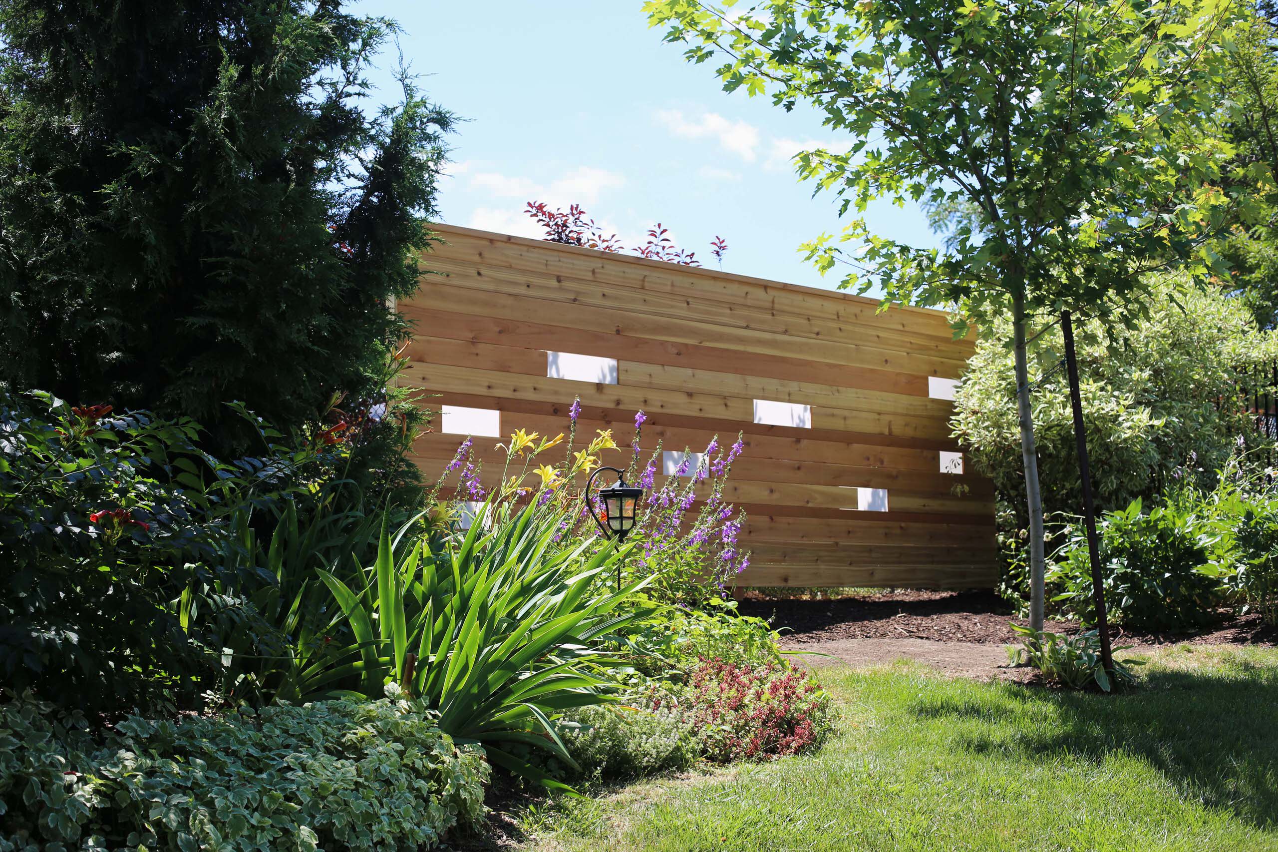 Der massive Sichtschutz aus Zedernholz bietet die dringend benötigte Privatsphäre und lässt gleichzeitig an manchen Stellen Ein- und Ausblicke zu.