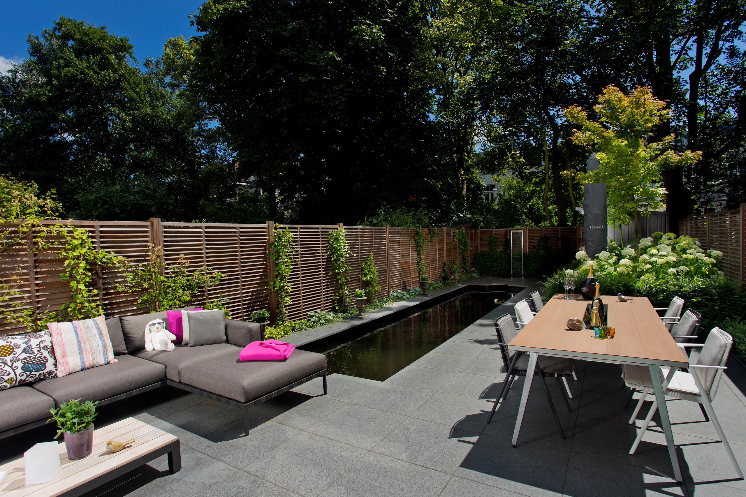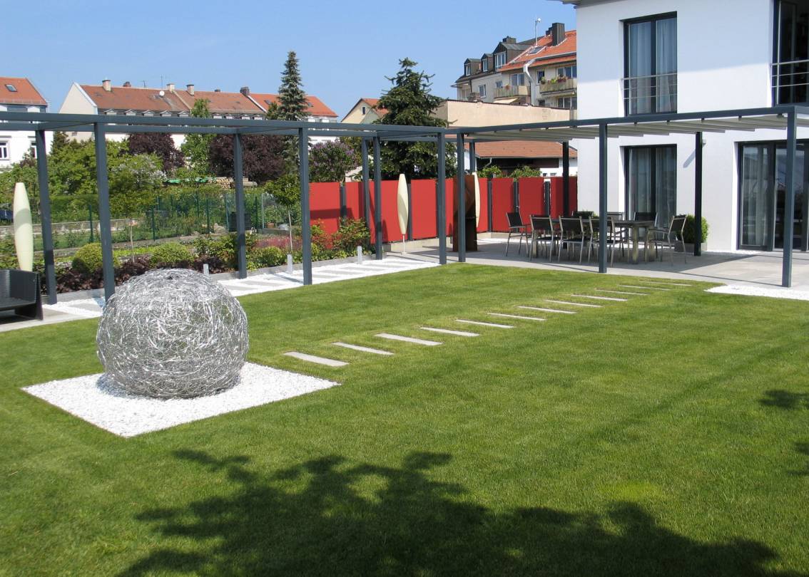 In diesem Garten sorgen Paneele aus rotem Kunststoff für Privatsphäre auf der Terrasse. Solche Sichtschutzelemente gibt es ebenfalls in vielen Varianten im Handel zu kaufen. Besonders schön ist hier der Komplementärkontrast des roten Kunststoffs mit dem Grün des Gartens.