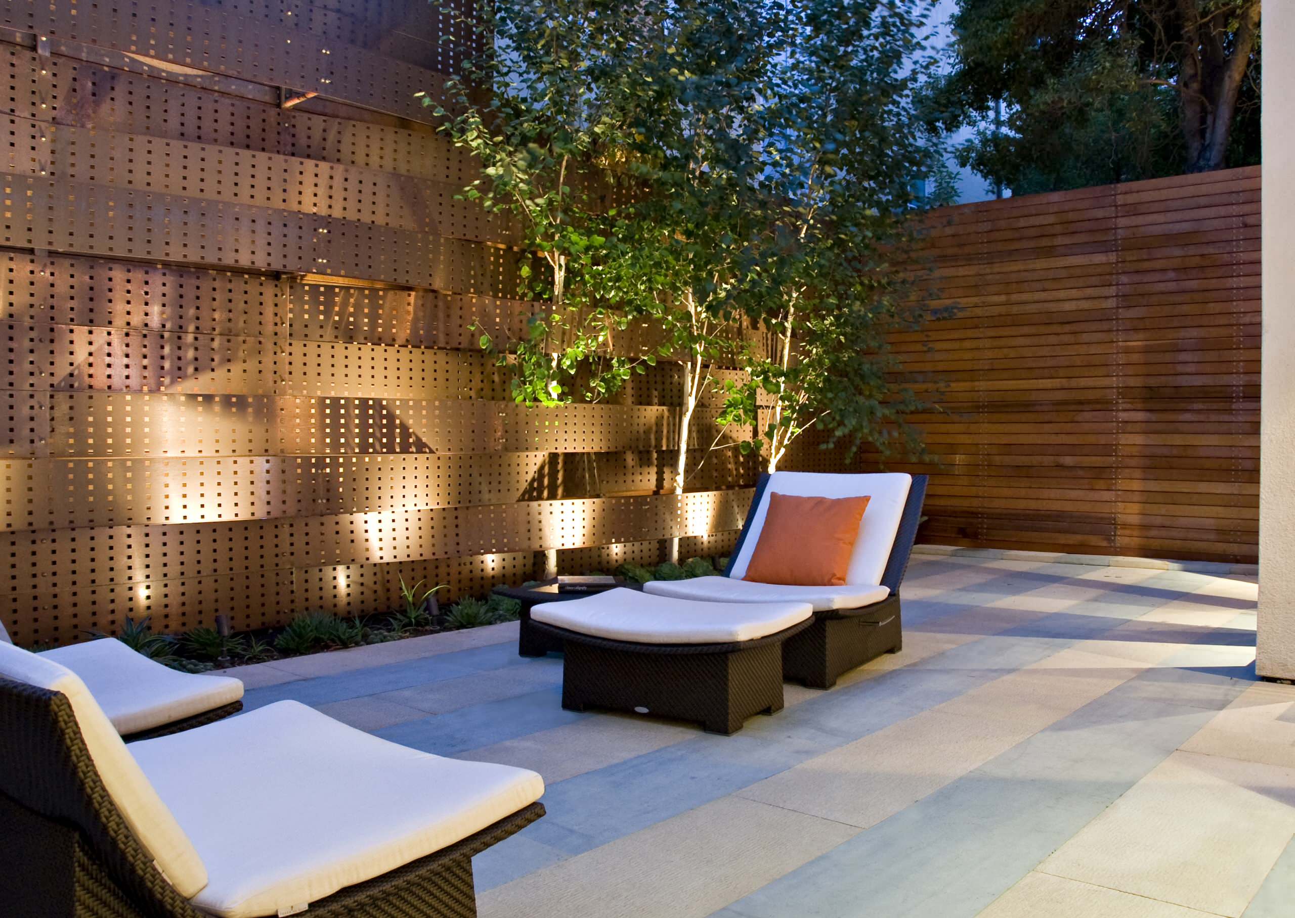 Wem Holz oder Stein als Materialien für den Sichtschutz zu klassisch erscheinen, kann moderne Elemente aus Metall verwenden. Metalle wie Kupfer (dessen warmes Orange hier durch die Beleuchtung besonders schön zur Geltung kommt), lassen sich gut mit Holz oder Glas kombinieren.