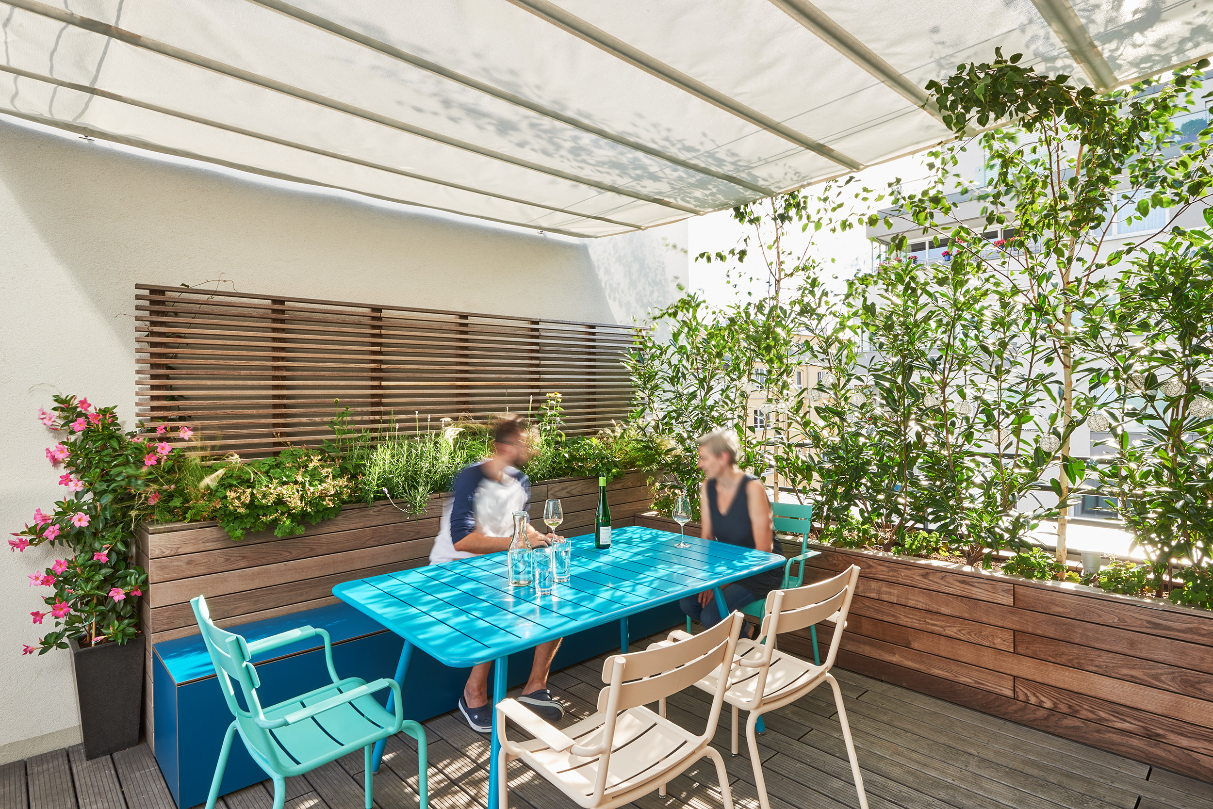 Ulrike Seher und Herwig Bindar von Gruenhoch3 fertigten für diese Dachterrasse in Wien Pflanzgefäße aus widerstandsfähiger Thermo-Esche. Den gewünschten Sichtschutz zum Nachbargebäude bilden darin gepflanzte Glanzmispeln und Birken. „Die Birken sorgen für eine schöne Herbstfärbung und lockern die Bepflanzung etwas auf“, erklärt Seher.