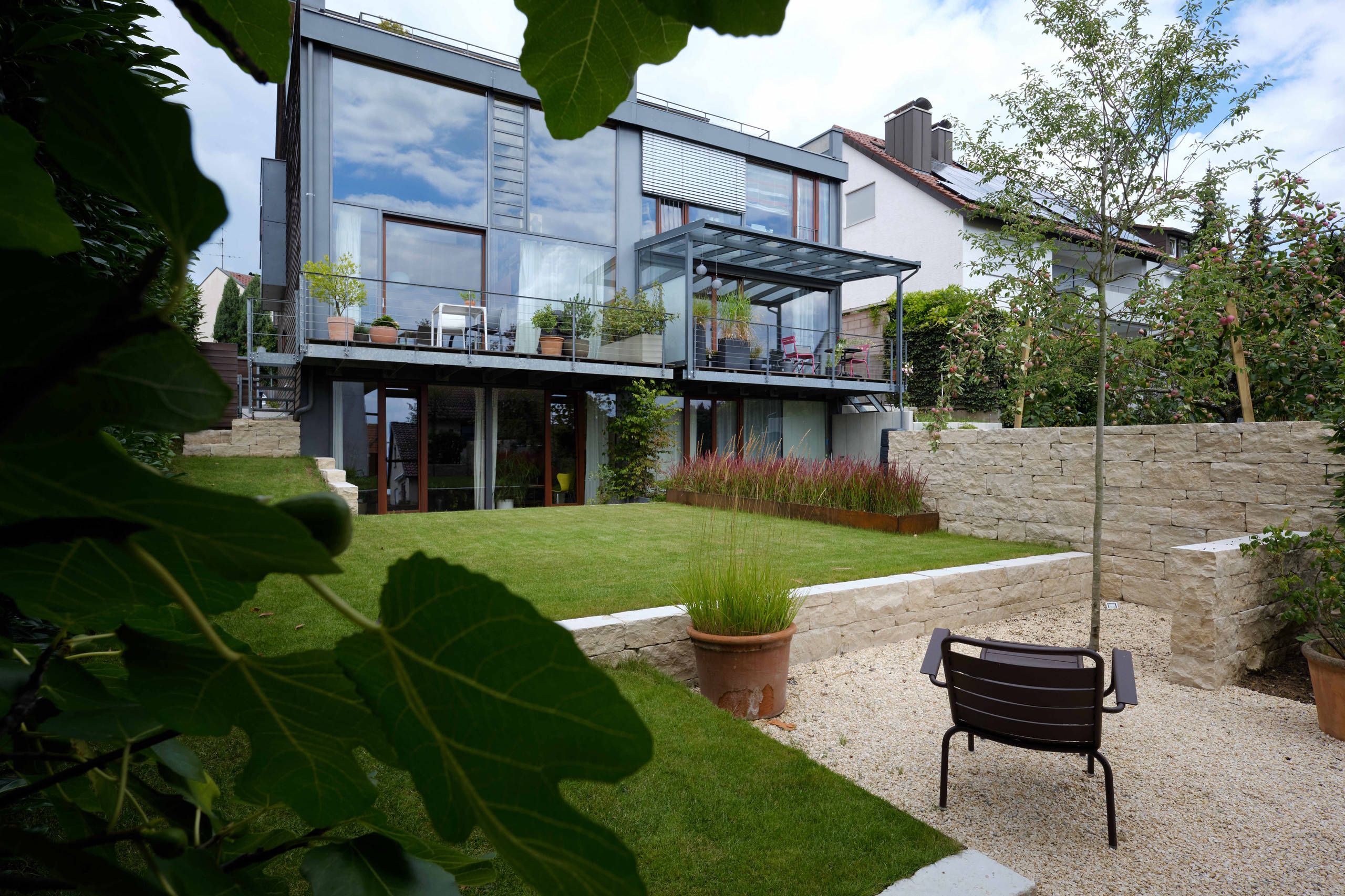Mauern bieten eine schöne Möglichkeit für dauerhaften Sichtschutz. Terrassen profitieren dabei von der Stabilität und Langlebigkeit. Sie können aus Beton, als verputzte Mauer oder besonders schön aus Natursteinen gestaltet werden. In diesem Garten im Landkreis Esslingen (Ba-Wü) verläuft eine bis zu 1,50 Meter hohe Mauer aus Dietfurter Kalkstein als Sichtschutz.