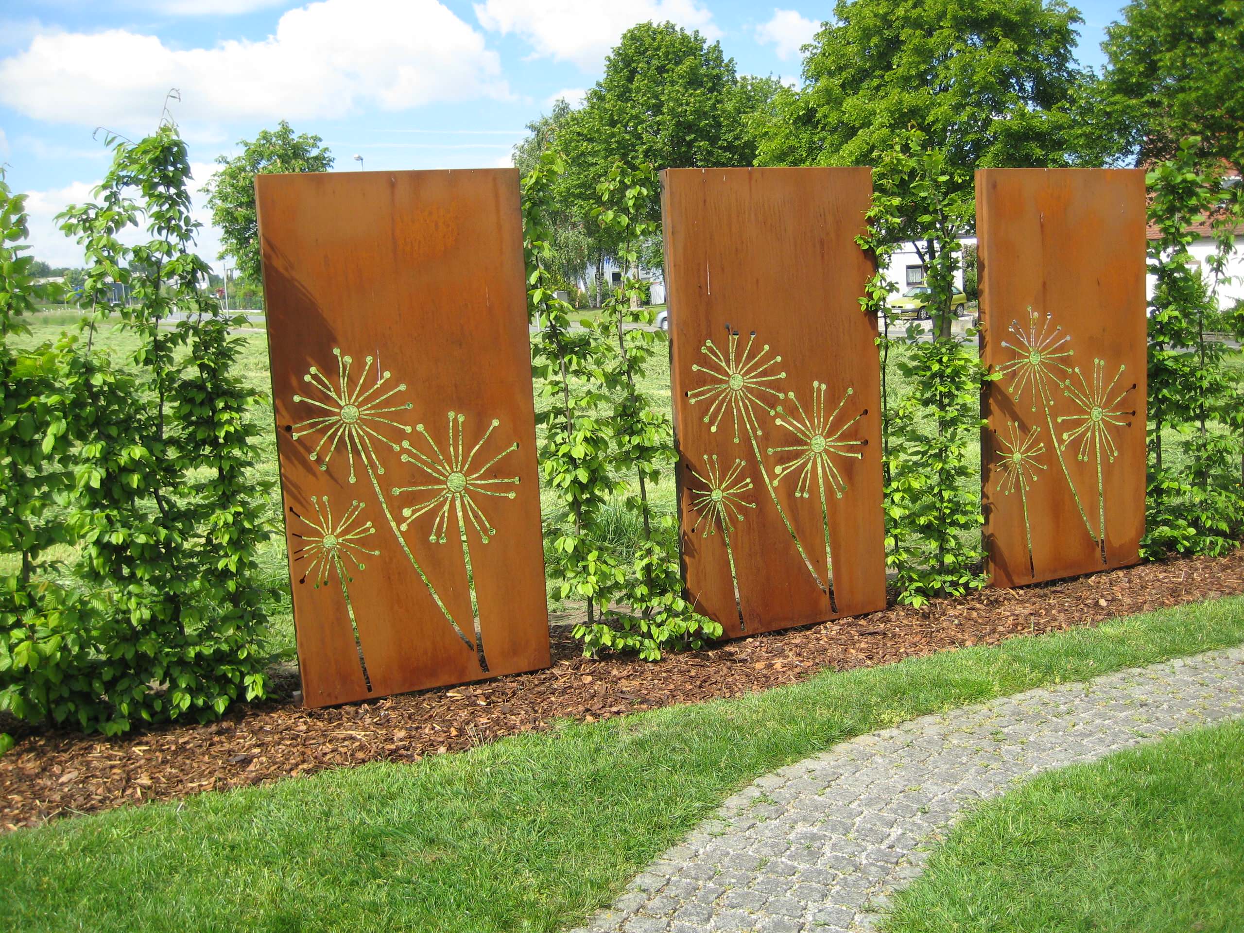 Sichtschutze aus Cortenstahl sind aktuell sehr angesagt. Sie sind äußerst robust und der typische Rost wirkt warm und sorgt für interessante Farbeffekte mit dem Gartengrün. Sichtschutzelemente aus Cortenstahl gibt es bereits vorgefertigt, auch mit eingefrästen Motiven.