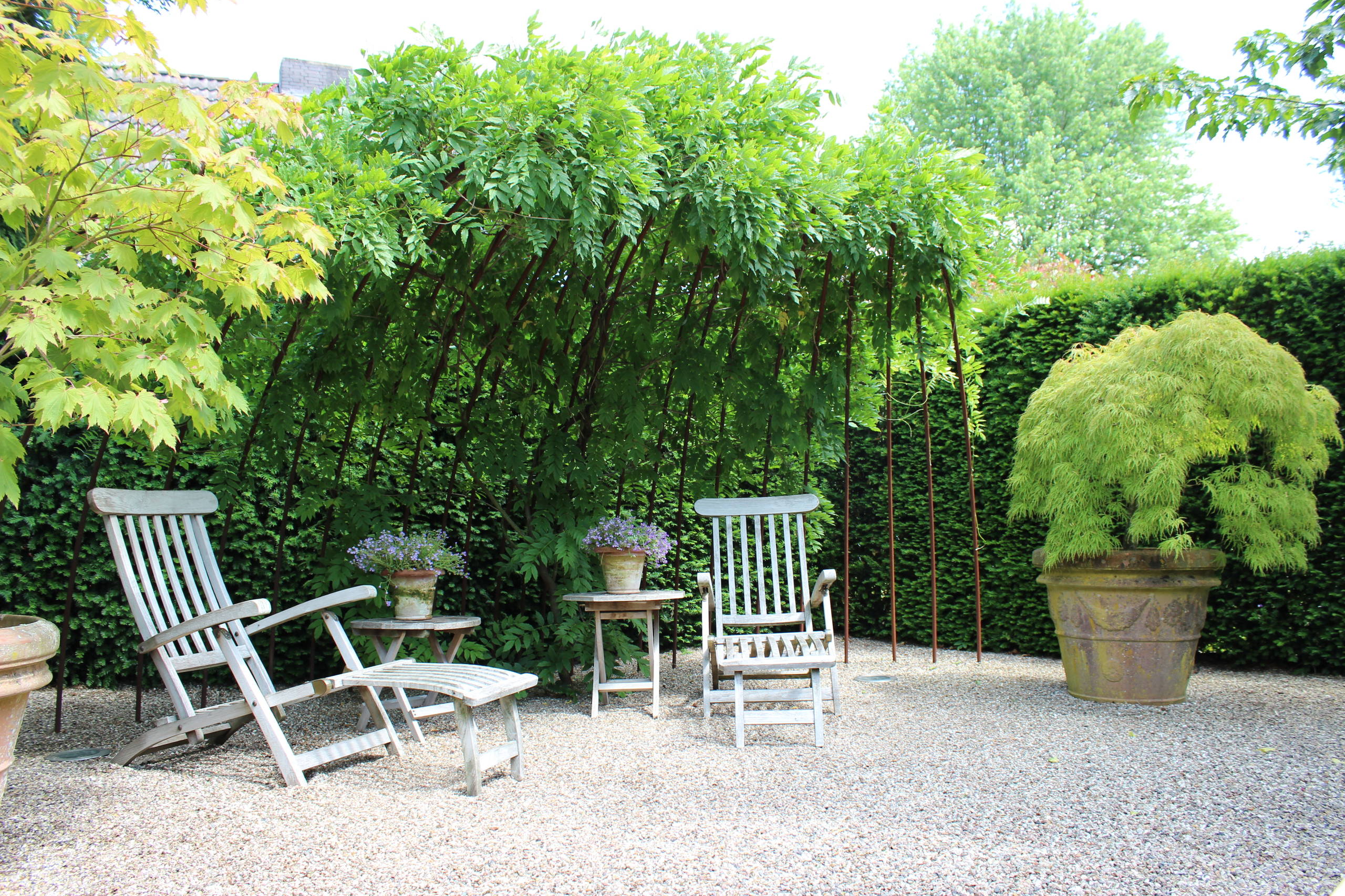 Fast schon kunstvoll wölbt sich diese Sichtschutz-Idee über den Sitzplatz in einem Privatgarten. Landschaftsarchitekt Soeren von Hoerschelmann ließ aus Stahl eine Muschel schmieden und mit Blauregen (lat. Wisteria) beranken. Darunter lässt es sich förmlich richtig einmuscheln.