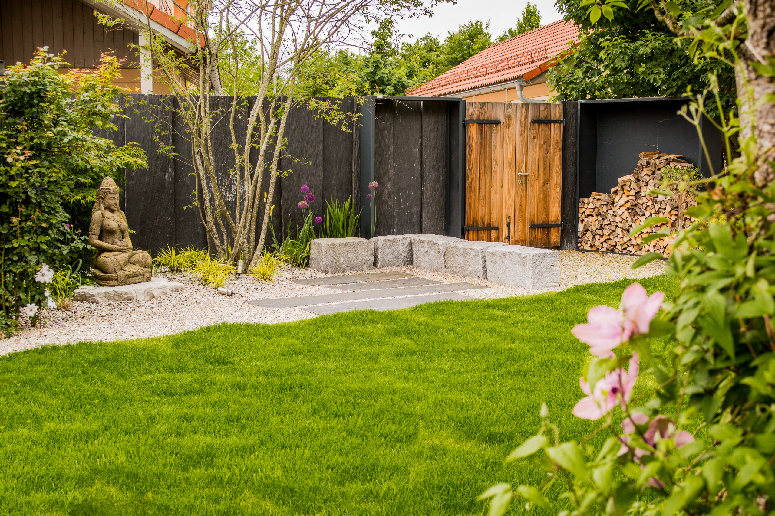 In diesem Garten mit Meditationsbereich fungieren Schieferplatten als Sichtschutz. Gartenprofi Werner Frick setzte dazu farblich passende Stahlelemente, die als Holzlager genutzt werden können.