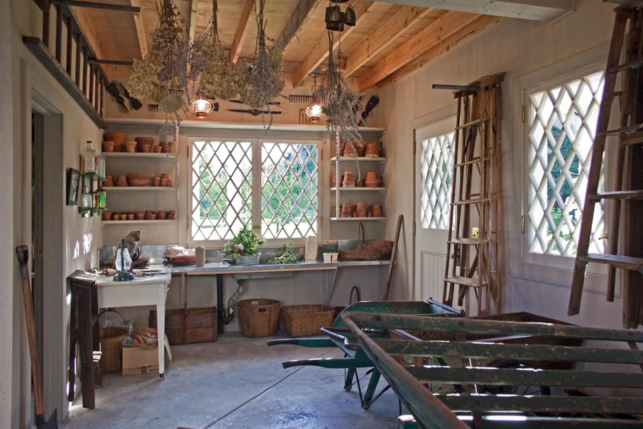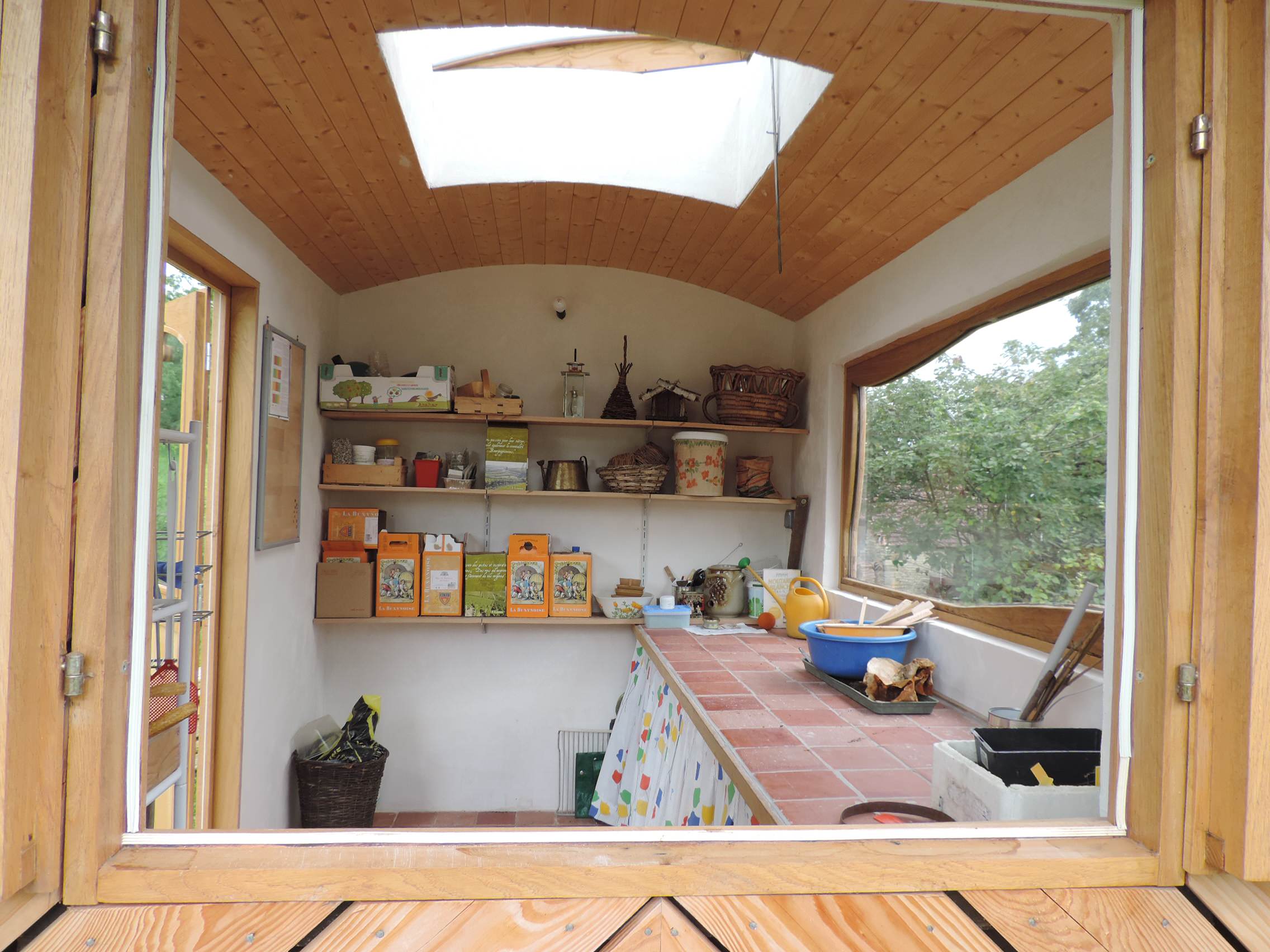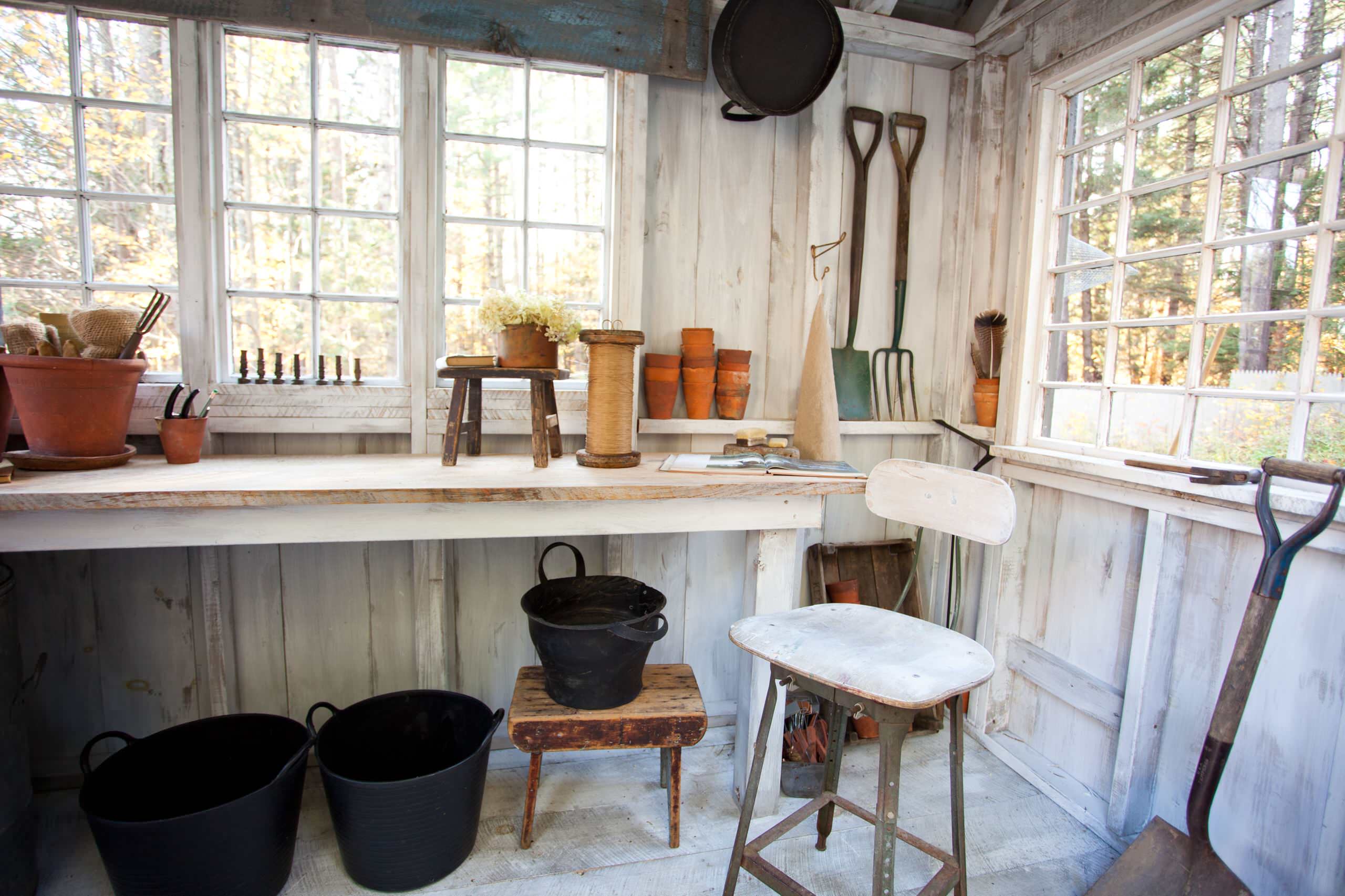 10. Arbeits- und Pflanztisch. Ein Arbeits- und Ablagetisch zählt für mich zu den wichtigsten Ausstattungselementen eines Gartenhauses. Hier können Sie etwas abstellen, reparieren, sortieren, topfen … Wichtig ist nur, dass diese Fläche frei bleibt! Haben Sie ein lichtspendendes Fenster im Gartenhaus, steht der Tisch am besten direkt darunter.