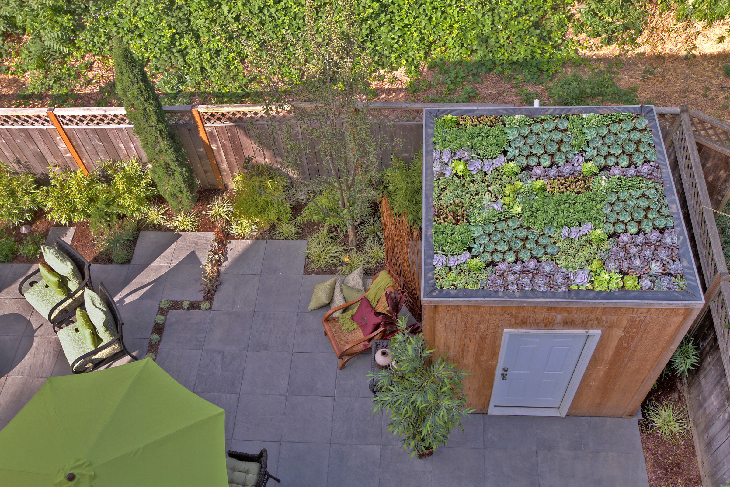 6. Begrünung des Gartenhausdachs. Denken Sie beim Gartenhaus auch an die Draufsicht. Wahrscheinlich können Sie, insbesondere bei einem kleinen Garten, aus den oberen Stockwerken Ihres Wohnhauses auf das Dach Ihres Gartenhauses blicken. Eine Dachbegrünung macht den Anblick gleich viel schöner. Auch eine Begrünung mit Kletterpflanzen bietet sich an.