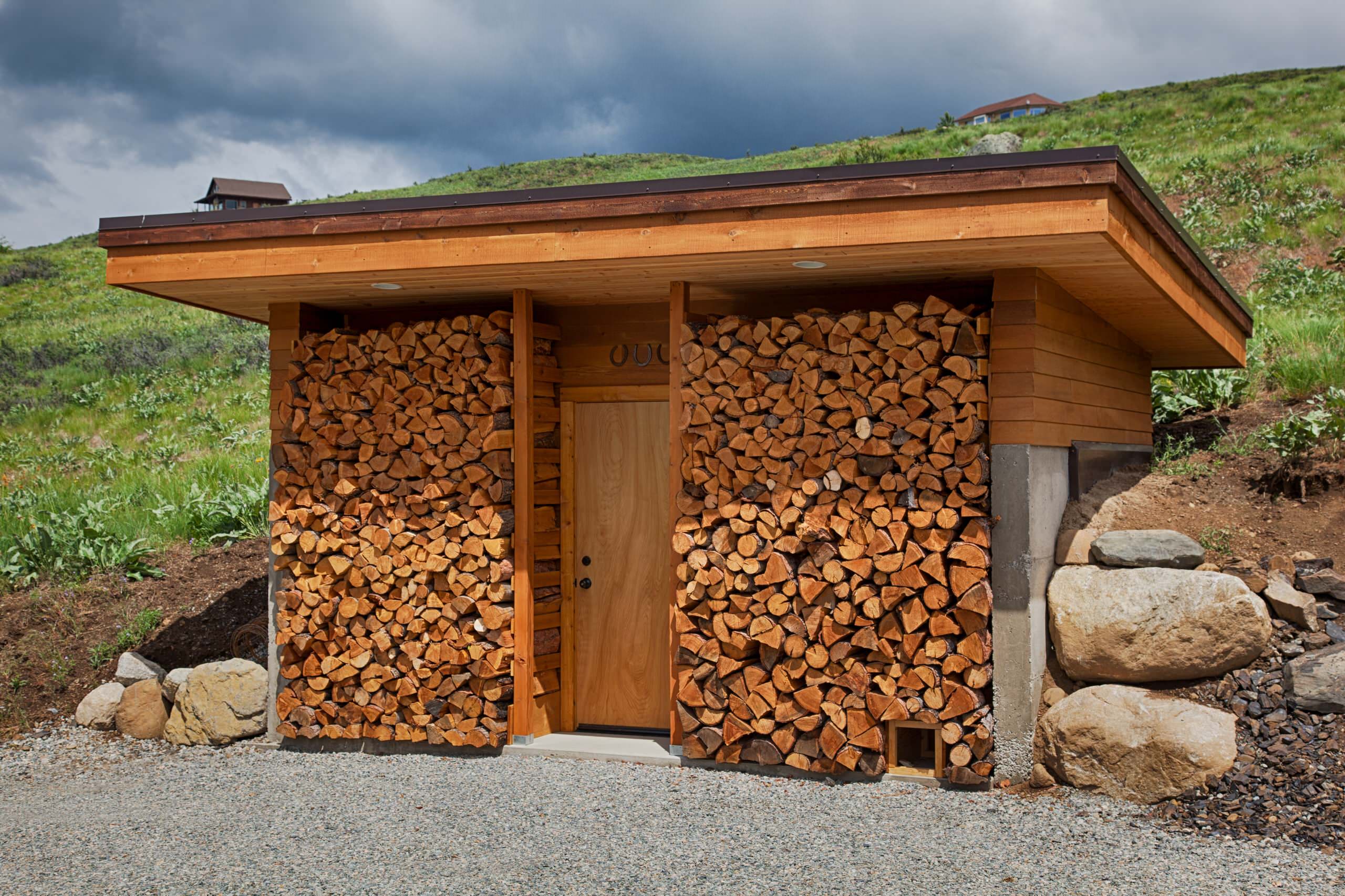 5. Dachüberstand einplanen. Ob Satteldach oder Pultdach – ein Dachüberstand bietet sich bei einem Gartenhaus manchmal an. Darunter können Sie etwa Kräuter trocknen, Holz lagern oder auch eine Sitzbank aufstellen. Bei diesem Beispiel wurde schon beim Bau Platz für mehrere Raummeter Holz eingeplant.