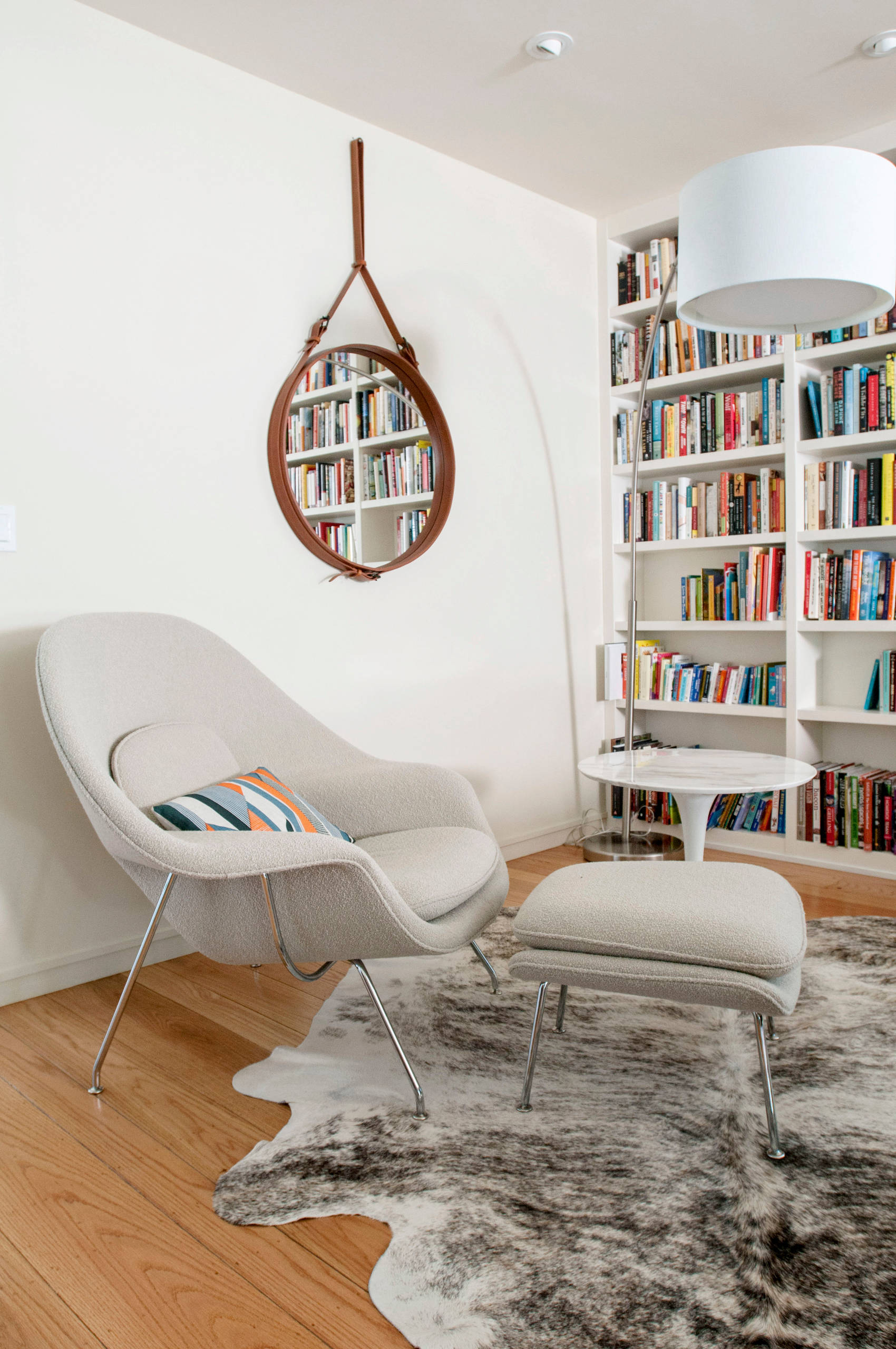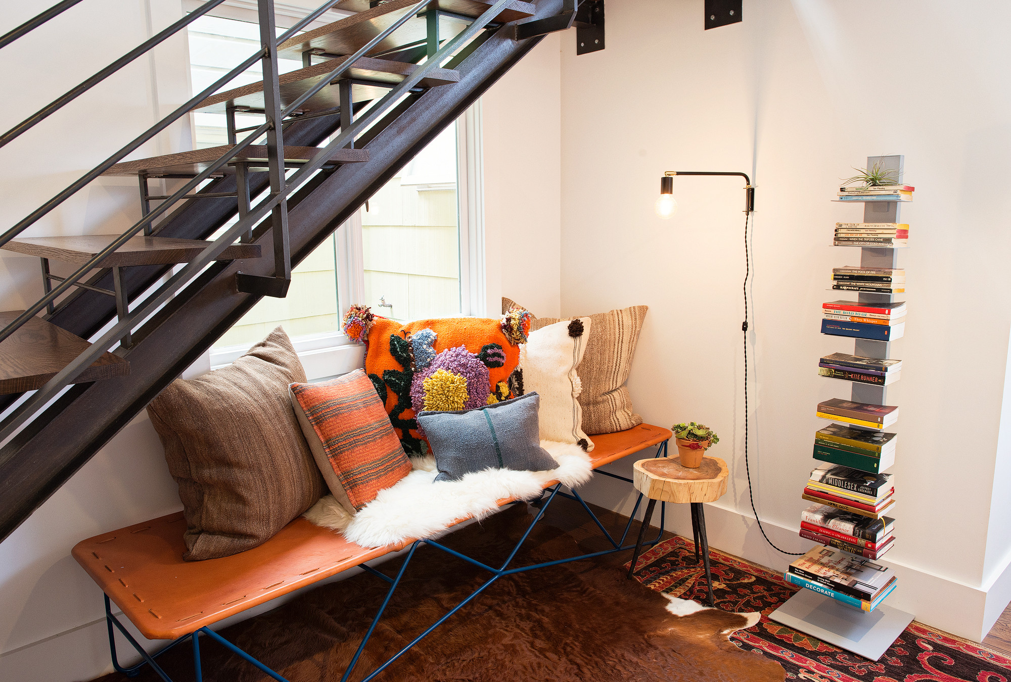 Nicht zu klein und nicht zu groß: Diese Leseecke bietet viel Gemütlichkeit auf wenig Raum. Ein uriger Zweisitzer trifft auf ein schmales, modernes Bücherregal, und als Lichtquelle dient eine Wandleuchte im Mid-Century-Stil.