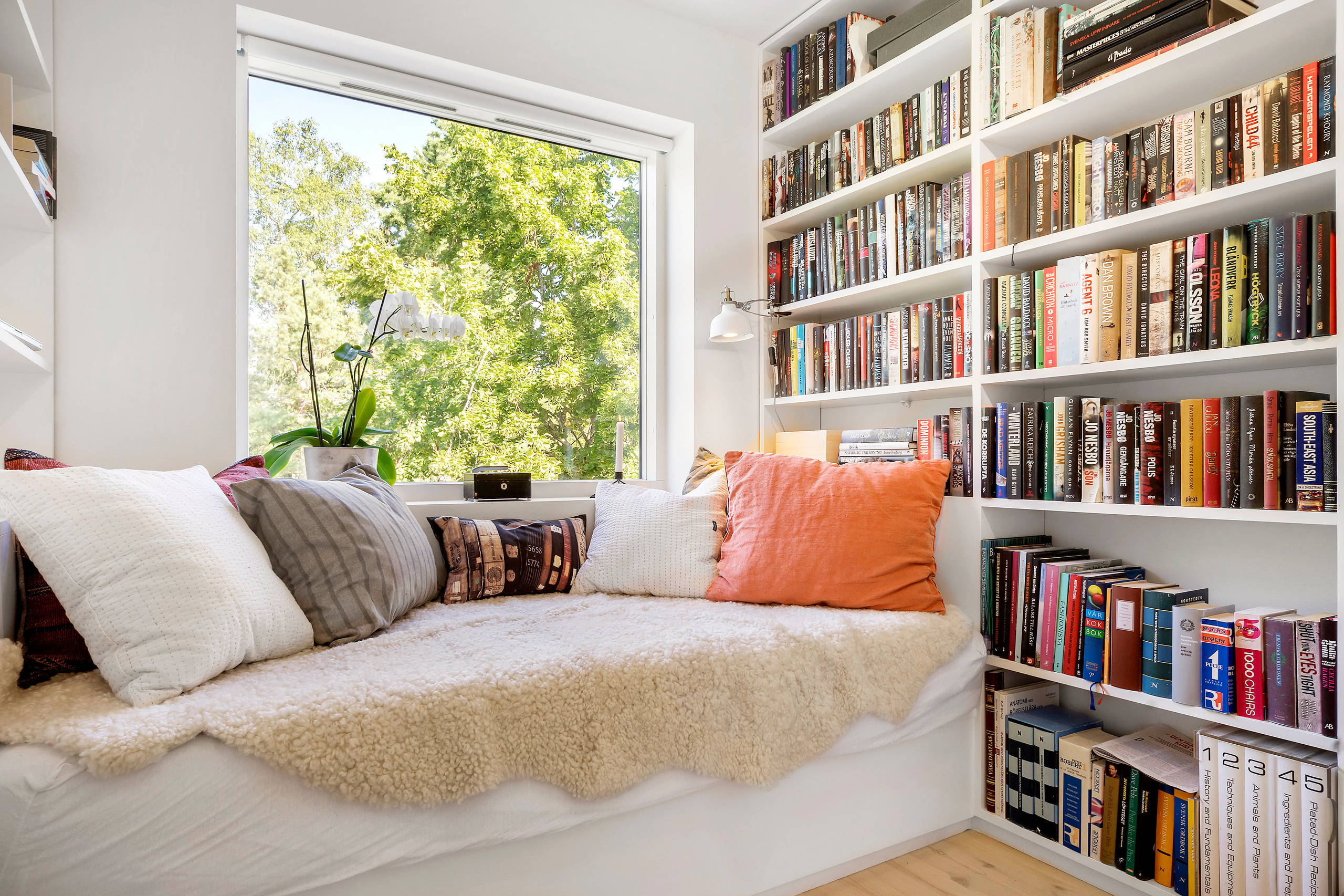 In dieser Stockholmer Wohnung treffen viele Bücher auf viele Kissen. Ergänzt durch Leselampe und Fell ergibt sich ein Daybed, in dem Tag und Nacht gelesen werden kann. Schließlich sollten Leseecken so gestaltet sein, dass Sie sie am liebsten gar nicht mehr verlassen würden. Diese Variante hat etwas von einer Sitzbank im Fenster, was ihre zusätzliche Gemütlichkeit ausmacht.