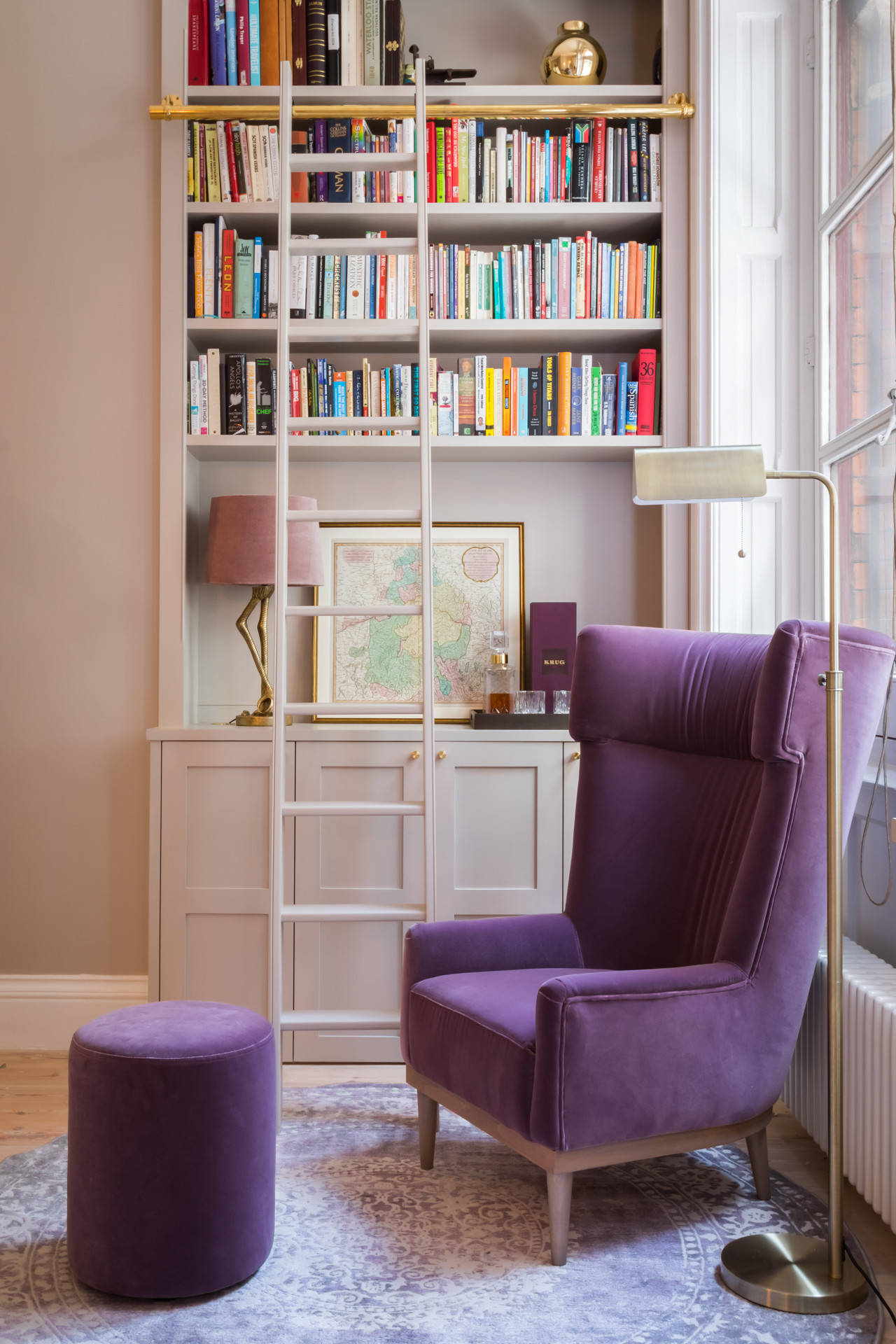 Diese Leseecke im Herzen Londons hat gewissermaßen bibliothekaren Charakter. Interior Designerin Sacha Berger entwarf dafür ein Bücherregal, das den Raumdimensionen dieses historischen Gebäudes gerecht wird und ließ es, samt der typischen Bibliotheksleiter, von einem Tischler nach Maß anfertigen. Die Stange, an der man die Bibliotheksleiter hin- und herbewegen kann, ist übrigens eine äußerst stabile Gardinenstange – auch Profis wissen eben zu tricksen. Der Mix aus pudrigem Nude als Wandgestaltung, Messing und dem Lesesessel in kräftigem Violett wirkt modern und charmant zugleich.