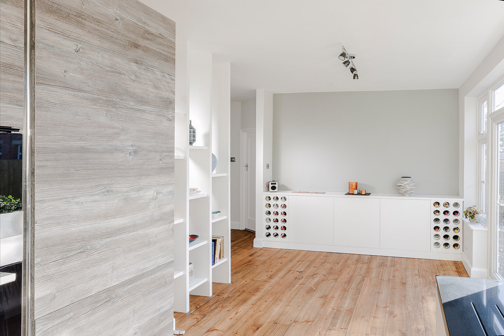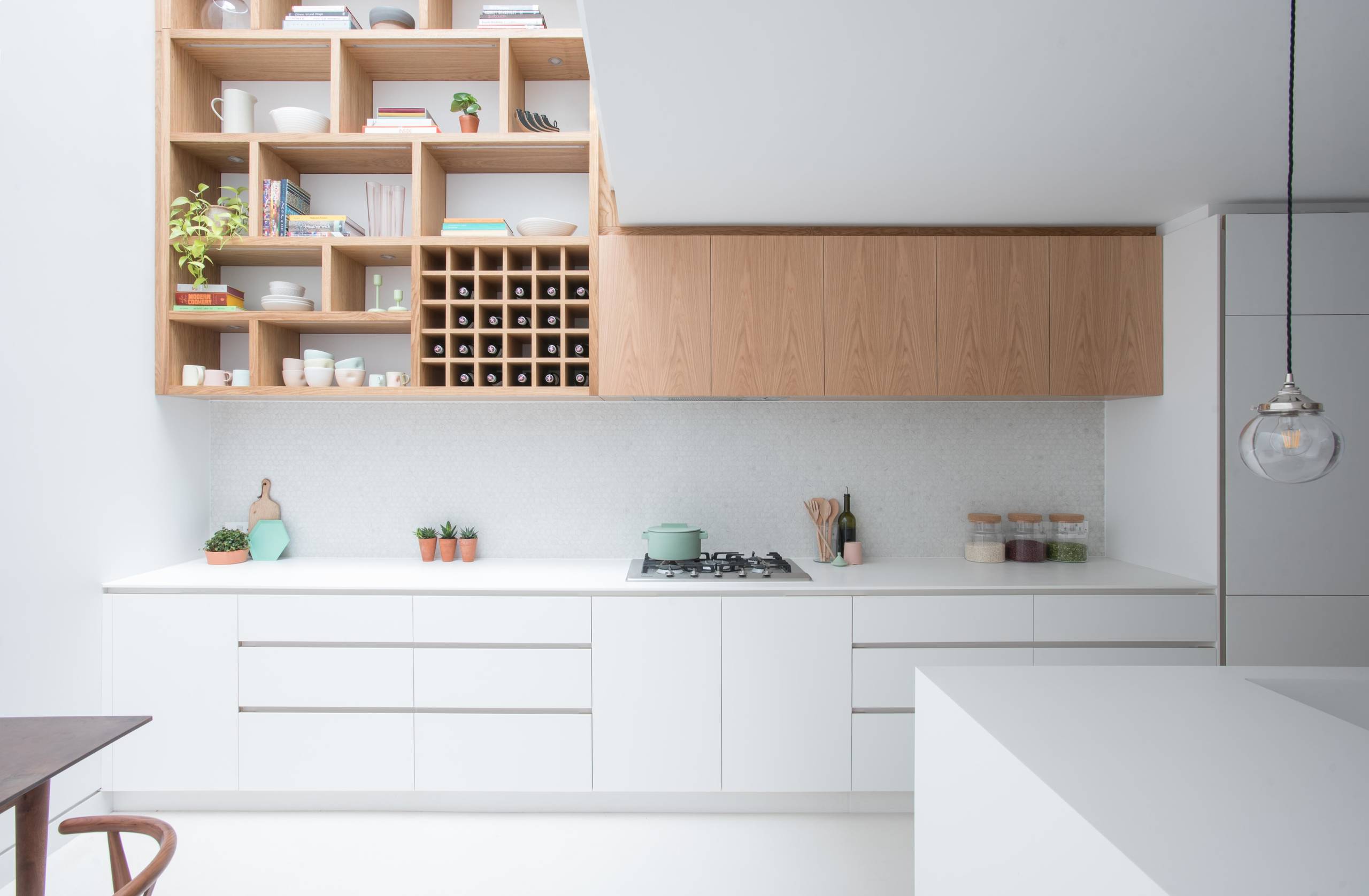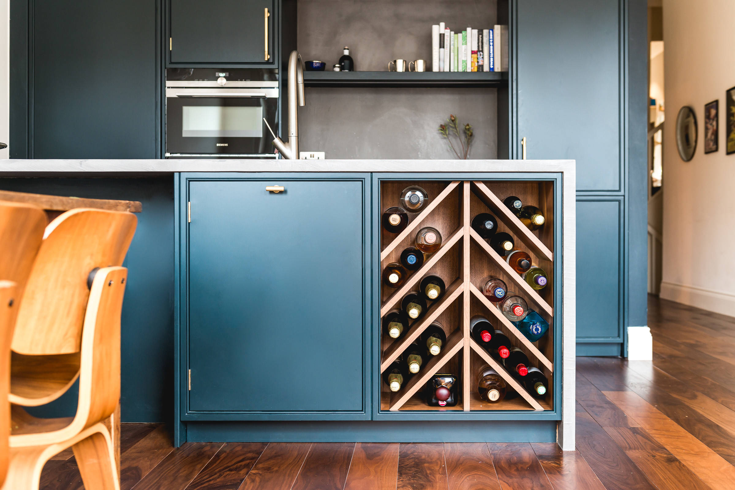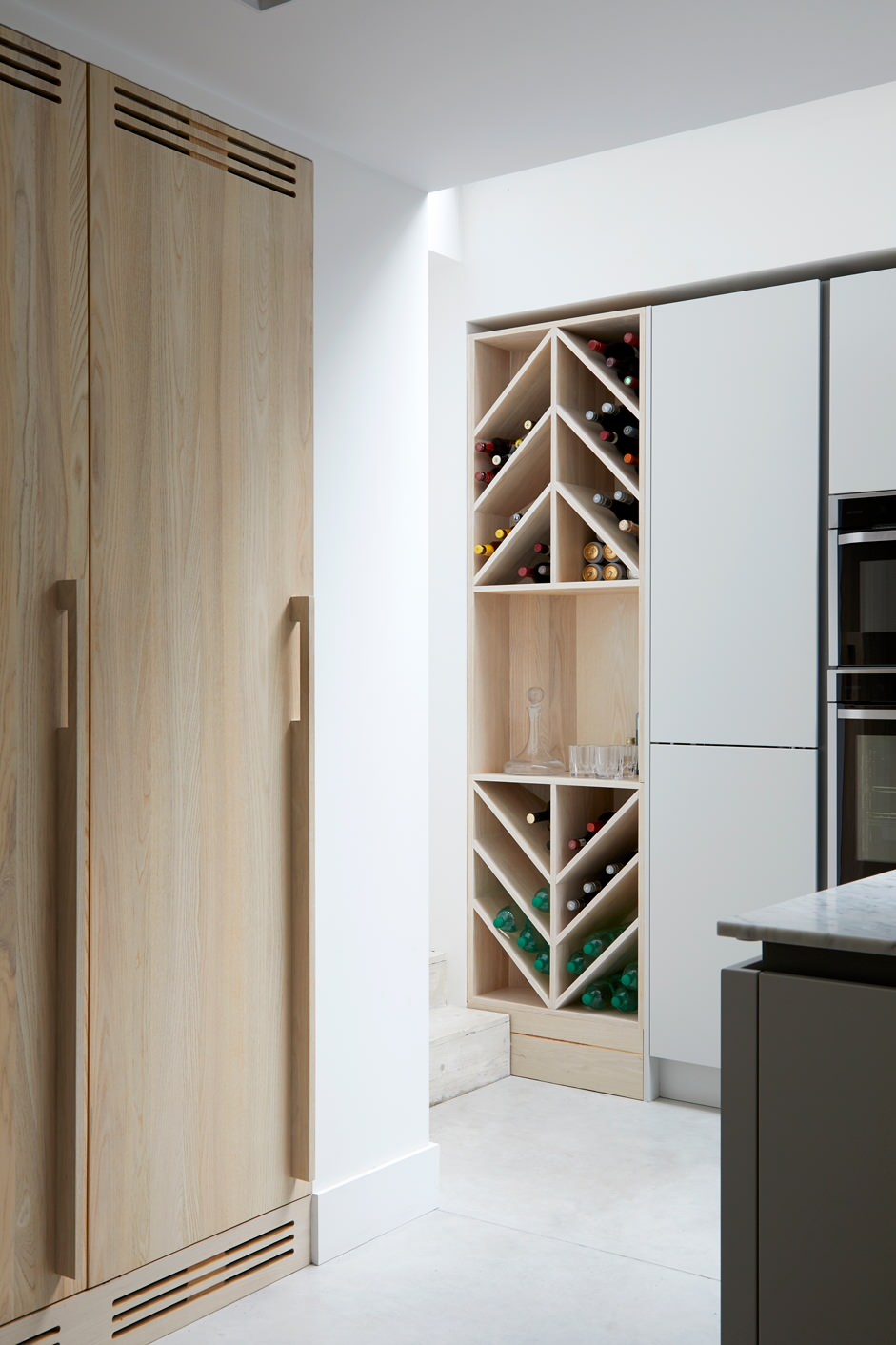 Eine diagonale Aufteilung des Weinregals verbreitet in dieser Londoner Küche eine positive Dynamik.