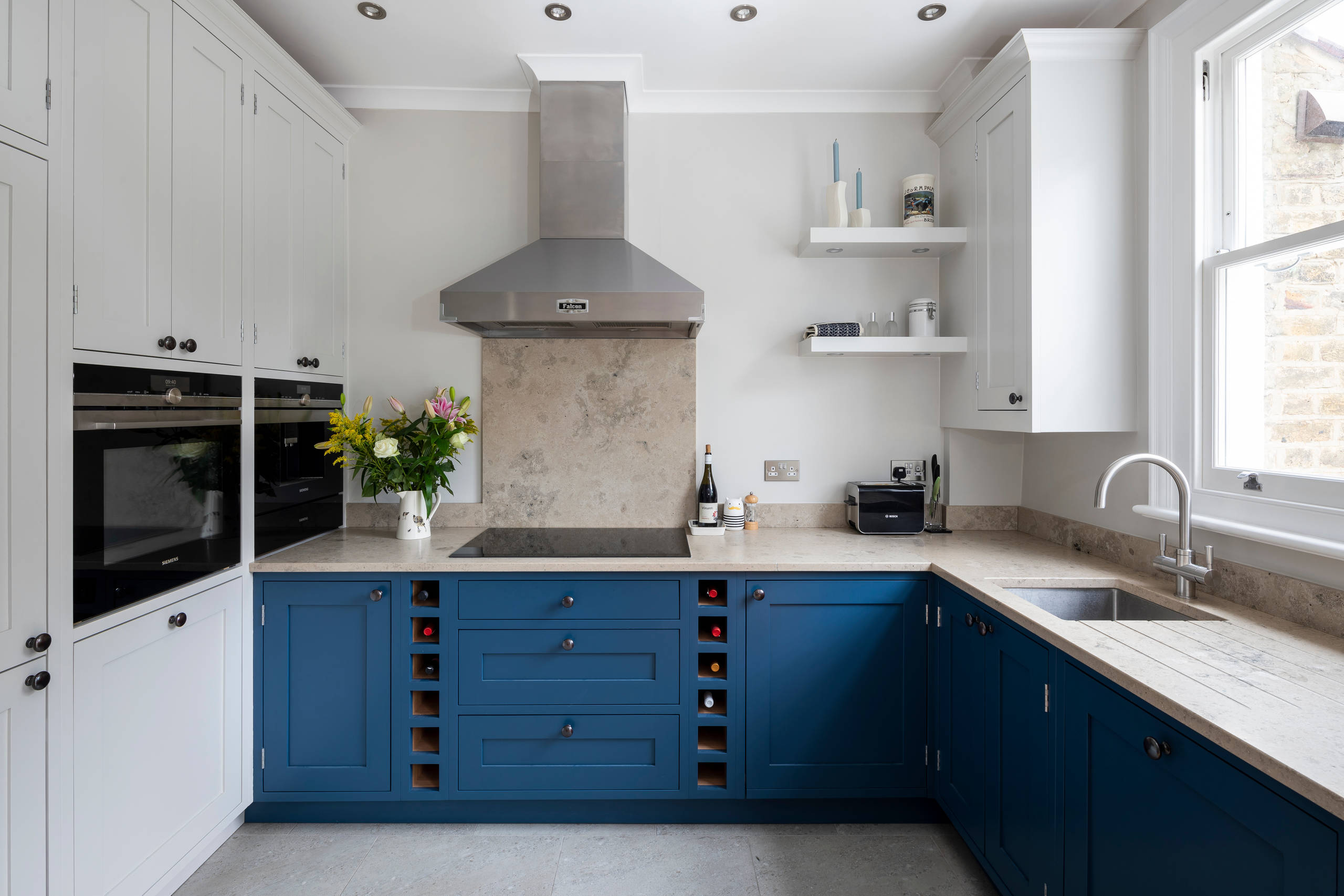 Jederzeit griffbereit lagert in dieser blauen Landhausküche der Kochwein rechts und links vom Herd in schmalen Weinregalen unter der Arbeitsfläche.