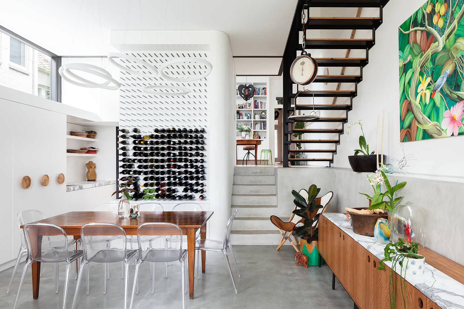 In Tischnähe hat in diesem Haus in Sydney der Wein seine eigene Nische gefunden. Die maßgefertigte Regallösung ist wahrhaft minimalistisch und rückt den Rebensaft in den Vordergrund.