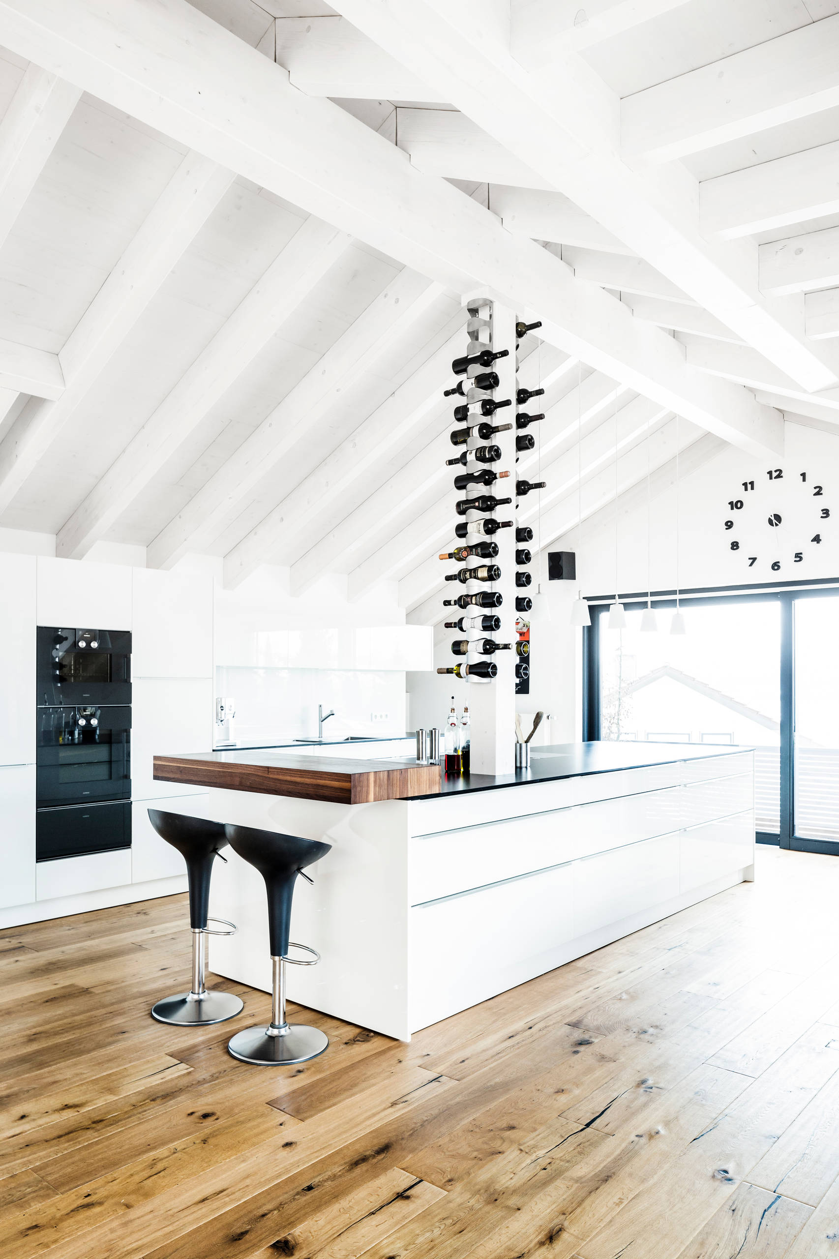 Bis unter den Giebel klemmen die Weinflaschen in der von anna cucina entworfenen Küche in Stuttgart. Zwischen Kochinsel und Tresen lagern sie dort jederzeit griffbereit – zum Kochen, Trinken und Freuen.
