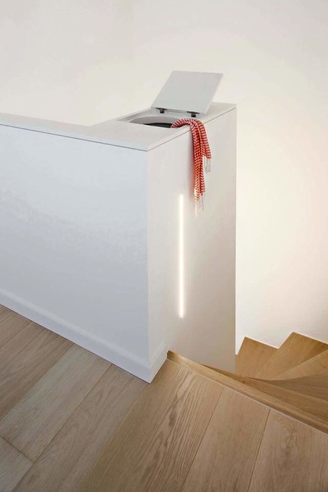 In die Kategorie „praktische Alltagshelfer” fällt unser nächstes Beispiel, das uns die Malerwerkstätte Alexander Fritz zeigt: Über einen Schacht, der in diesen Treppenaufgang integriert ist, gelangt Wäsche vom Dach in den Keller. Das spart nicht nur Wege und Wäschekörbe, sondern hilft auch den Kindern beim Ordnunghalten.