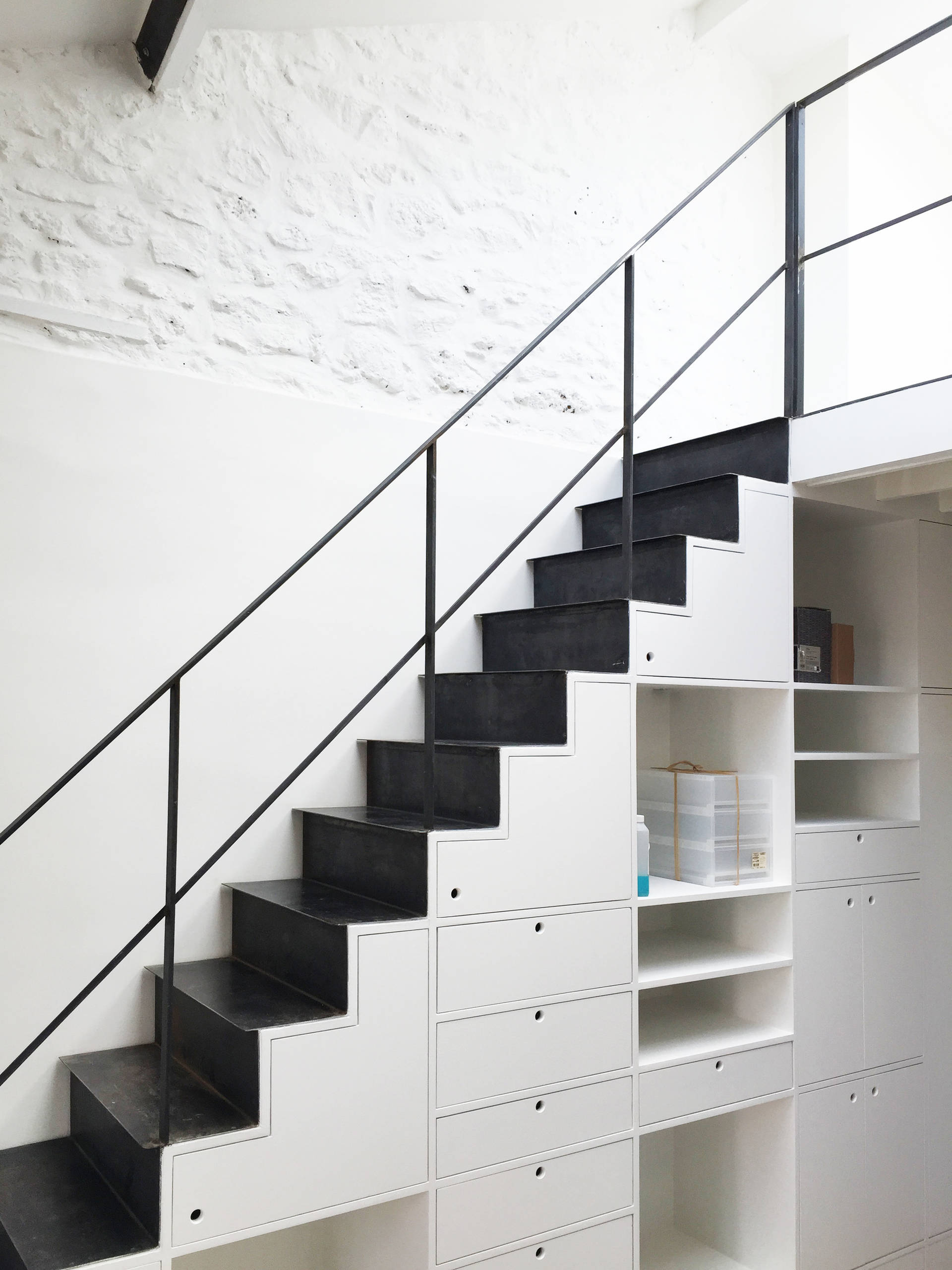 Diese Treppe in einem kleinen Pariser Apartment führt hoch hinauf ins Dachgeschoss. Mit einer Kombination aus offenen Regalfächern und geschlossenen Schränken ersetzt sie sowohl die klassische Schrankwand als auch das Bücherregal – und wirkt dabei mit weißen Fronten und runden Grifflöchern immer noch luftig und leicht.