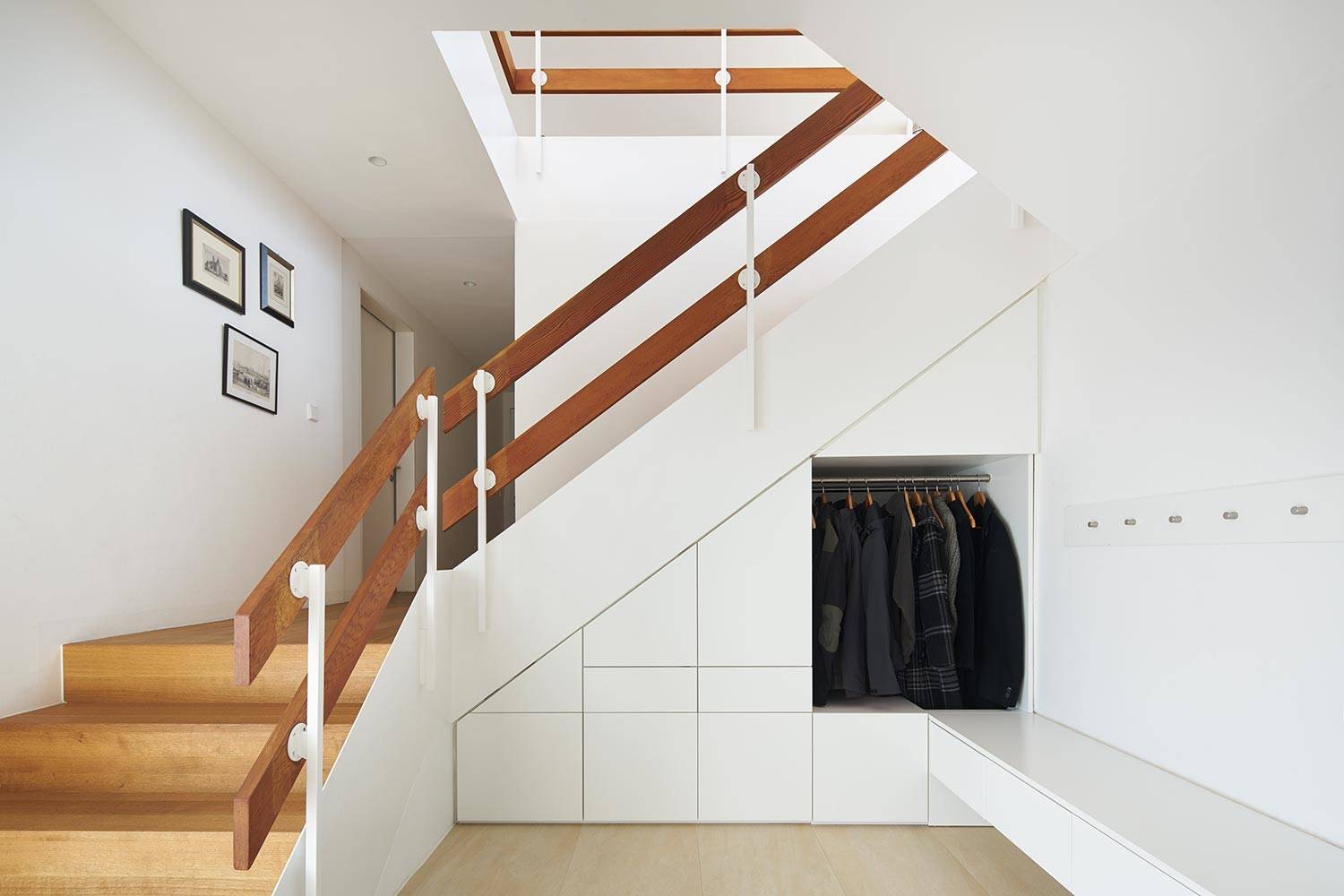 Ebenfalls einen Schuhschrank integrierten die Bewohner dieser Londoner Doppelhaushälfte in ihre Treppe aus amerikanischem Schwarznussholz. Dabei nutzt das ausziehbare Schuhregal die volle Tiefe der Treppenstufen und verschenkt keinen Zentimeter wertvollen Stauraum. Dank seiner unauffälligen Griffmulden fällt der Schuhschrank auch gar nicht weiter auf, wenn er geschlossen ist.