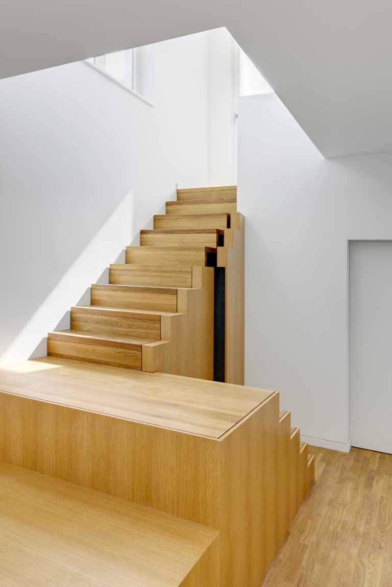 Dezent können die Bewohner dieses Berliner Wohnhauses den Stauraum unter der Treppe nutzen, ohne dass es bei geschlossener Tür irgendeinen Hinweis darauf gäbe, dass sich dort gleich eine ganze Abstellkammer verbirgt. Denn in der Konstruktion von Franke Architekten verbirgt sich der Zugang zum Hohlraum unter der Treppe in einem Teil ihrer hölzernen Seitenverkleidung, die ohne Klinke oder Griff nicht als Tür erkennbar ist.