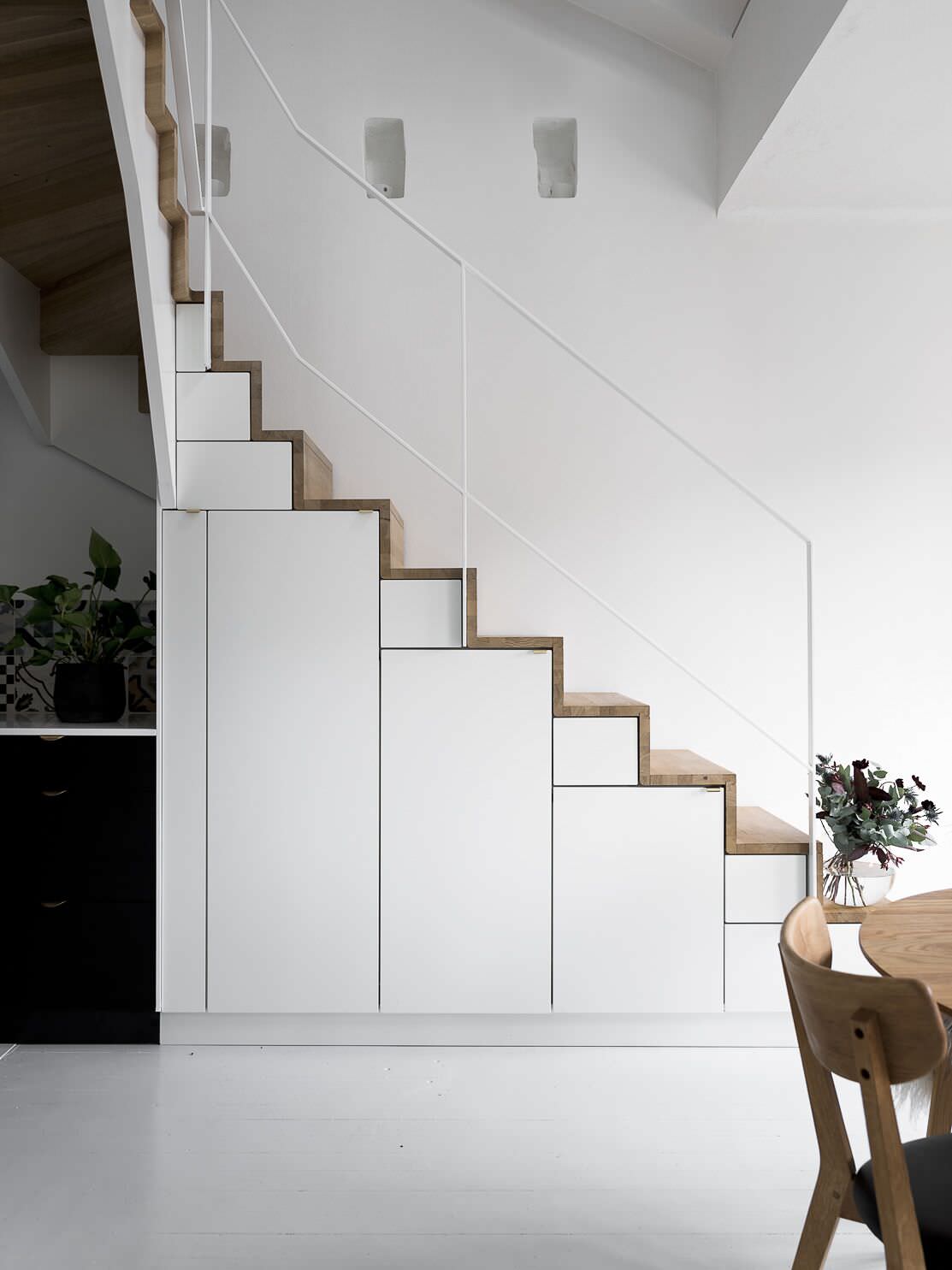 Stauraum unter der ersten Hälfte, die Küche unter dem Rest der Treppe: In diesem schwedischen Wohnhaus teilt sich der Raum unter der Treppe in zwei Funktionsbereiche – und in Schwarz und Weiß: Der Platz unter den ersten niedrigen Stufen wird für weiße Einbauschränke genutzt. Daran schließt sich eine einfache schwarze Küchenzeile an, die den verbleibenden Platz unter dem verwinkelten Treppenhaus voll ausnutzt.