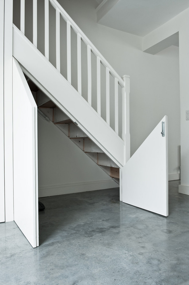 Eine ganz andere Wirkung entsteht in diesem Haus in Sydney durch das enge Raster des Regals unter der Treppe. Die Breite der Elemente orientiert sich an den einzelnen Stufen. So überträgt sich die Dynamik der Treppenstufen auf das Regal und sorgt für Bewegung im Raum.