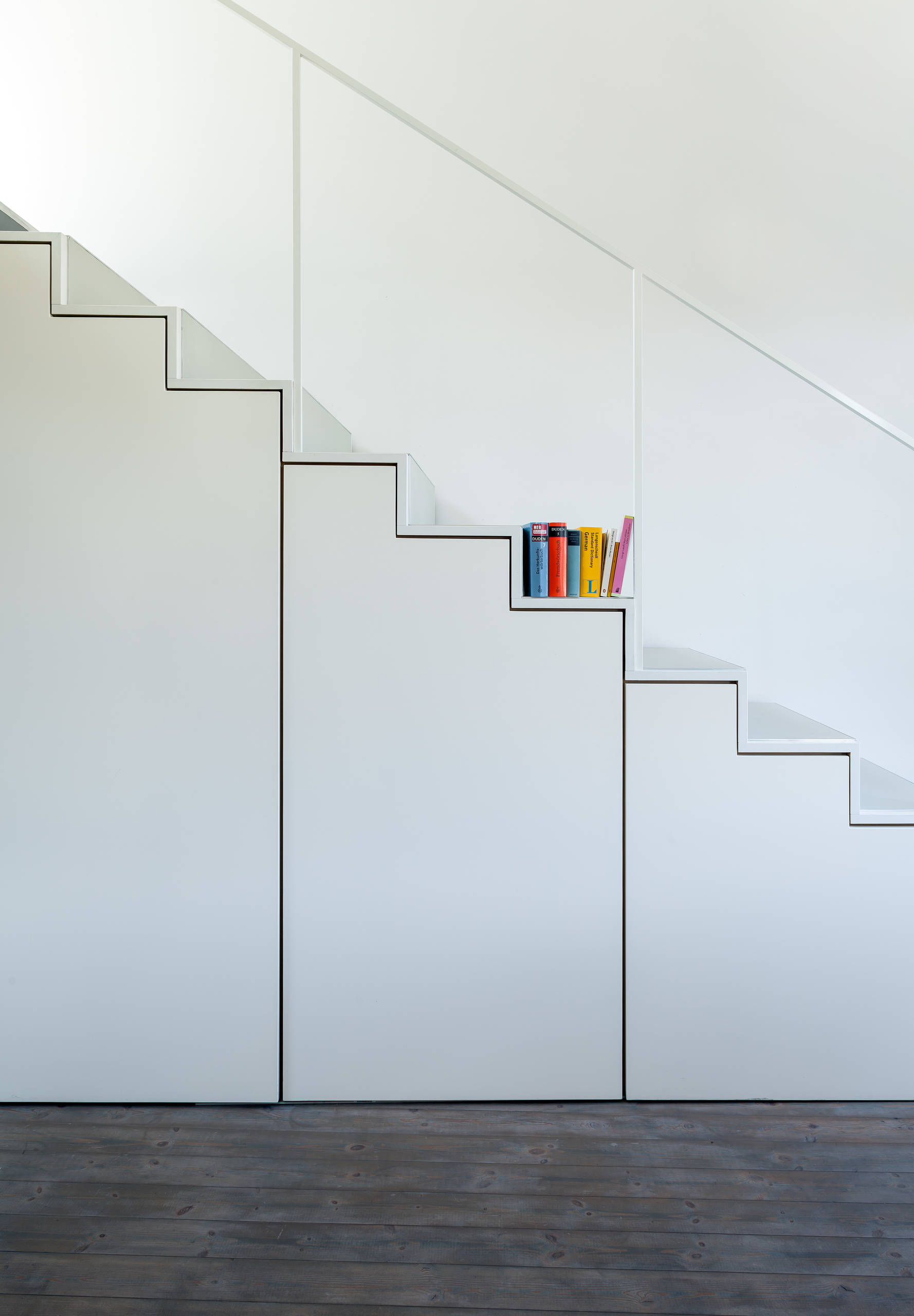 Fast unsichtbar wurde auch unter dieser Treppe eine Schranklösung integriert. Hier kommen die Schranktüren ebenfalls ohne Griffe aus, und an ihrer Oberkante nehmen sie die abgestufte Form der Treppe auf.