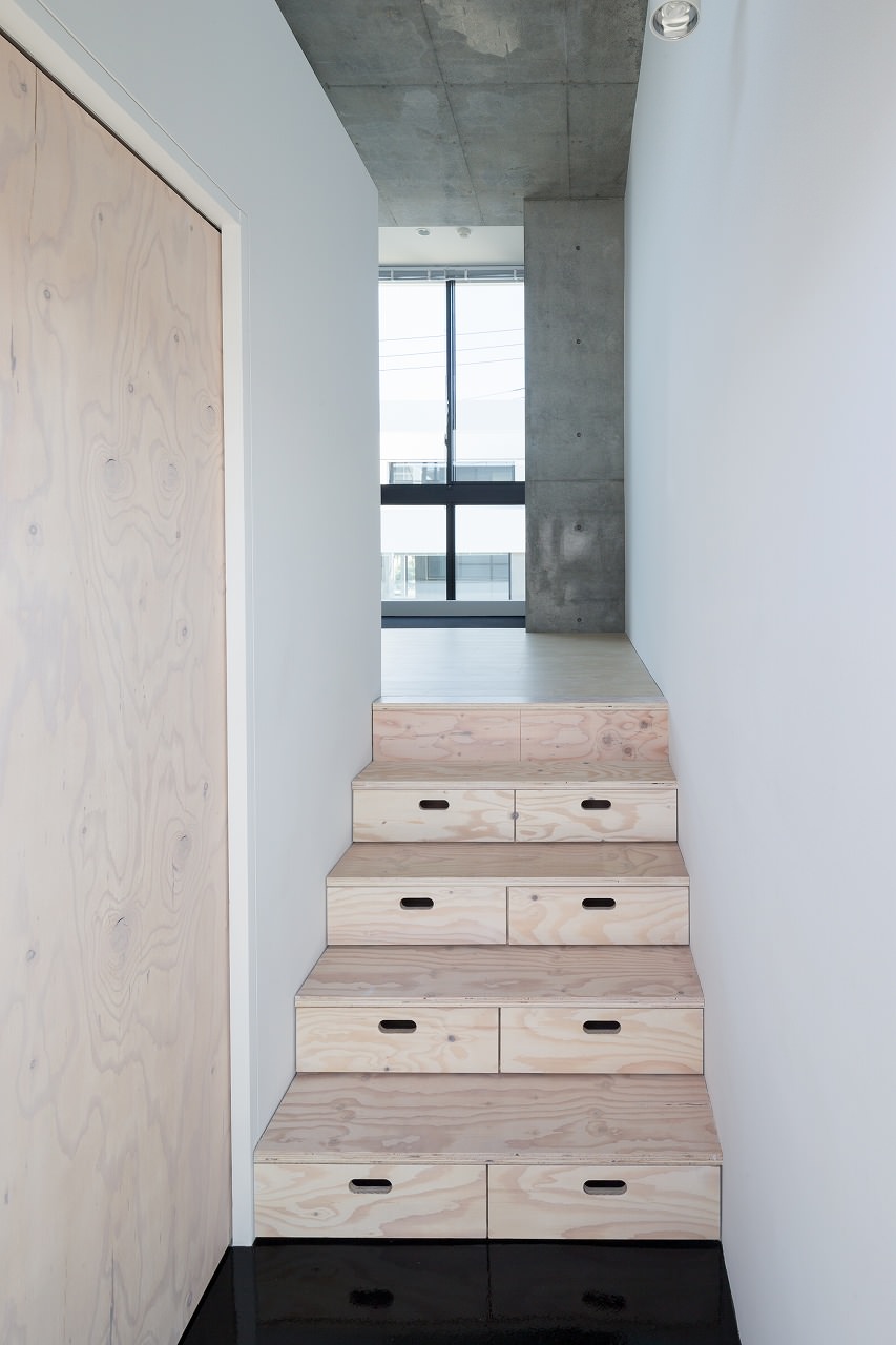 Eine andere Stauraum-Lösung fanden die Bewohner dieser Wohnung in Tokio für ihre Treppe aus Birkensperrholz: Weil sie von beiden Seiten durch Wände begrenzt ist und somit eine seitliche Nutzung nicht möglich war, wurden in jede Treppenstufe zwei Schubladen integriert, die sich nach vorn herausziehen lassen.