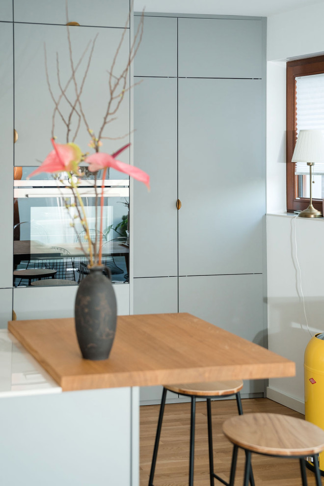Die perfekte Lösung fand die Expertin für die Ecke ganz rechts, die keine geraden Wände hat: „Wir haben dort einen Schrank eingebaut, mit denselben Fronten wie in der Küche. Dadurch wurde alles zu einer Einheit und die schrägen Wände fallen nicht mehr auf.“