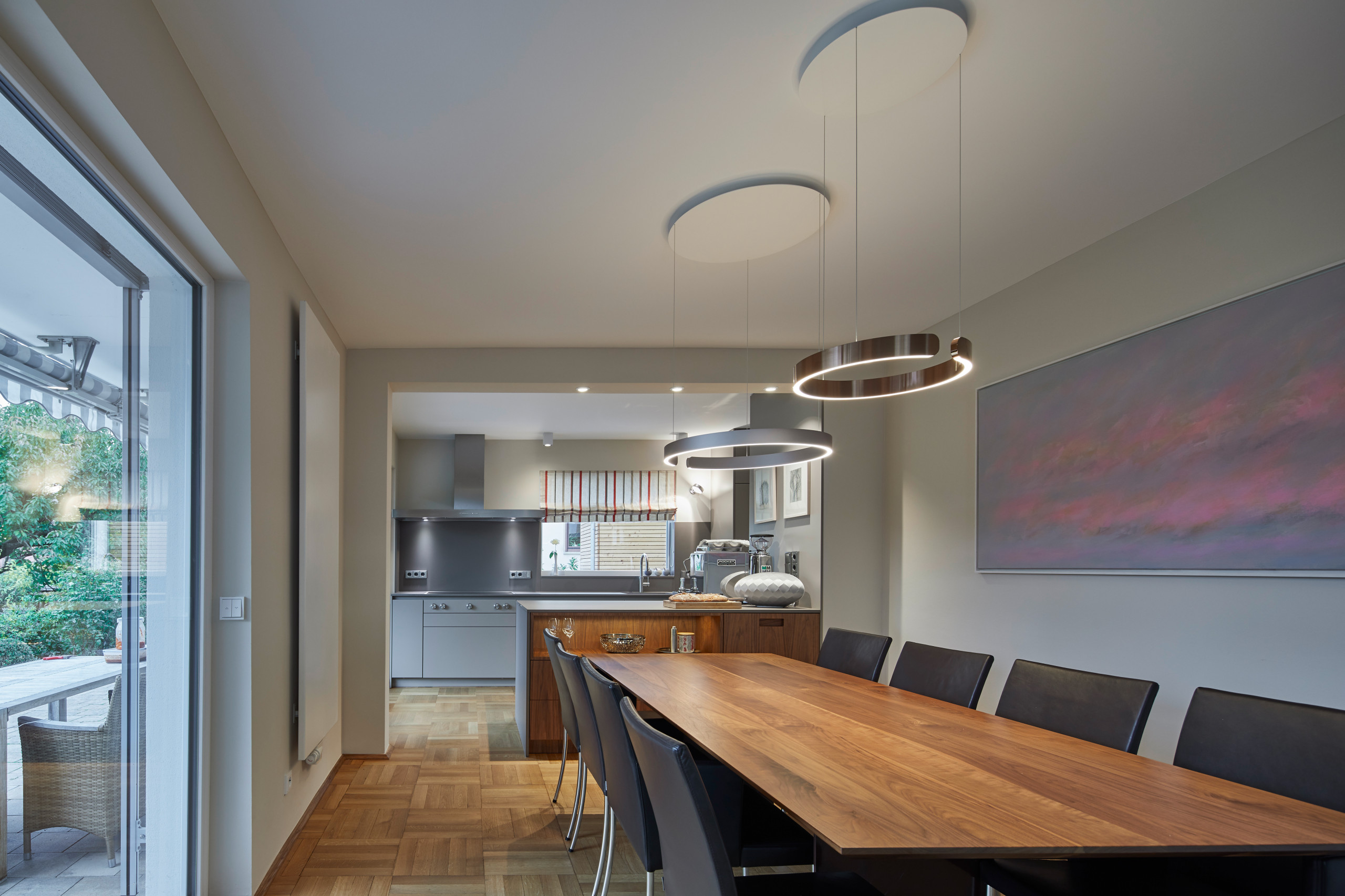 Was sich die Auftraggeber wünschten: Die komplette Wohnung des jungen Paares sollte kernsaniert und umgebaut werden; die neue Küche wünschten sich die beiden „gemütlich, stylish und funktional zugleich“. Eine Küche fürs gesellige Beisammensein mit Familie und Freunden. Dafür sollte der Kochbereich so in den Raum integriert werden, dass Koch und Köchin beim Zubereiten der Speisen mitten unter der Gesellschaft sind. Als Bonus sollte der Ausblick in den Garten uneingeschränkt möglich sein.