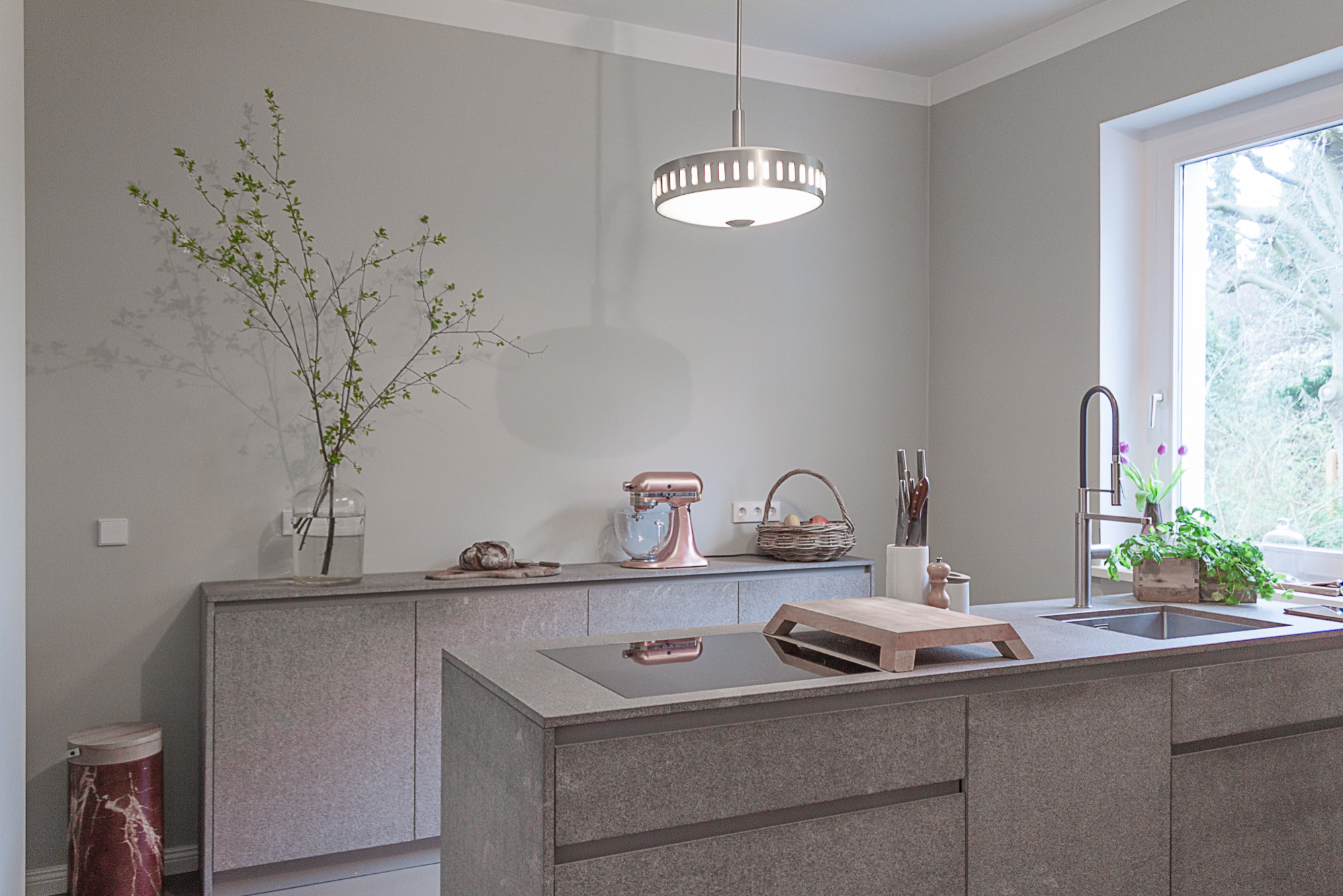 Herausforderung: „Der Raum ist vom Layout nicht ganz einfach und die Platzierung der Insel war tricky“, berichtet Nikola Bacher. „Durch die leichte Verschiebung in den hinteren Teil des Raumes wirkt die Küche nun nicht zu blockig und passt sich an die Länge des Raumes an.“