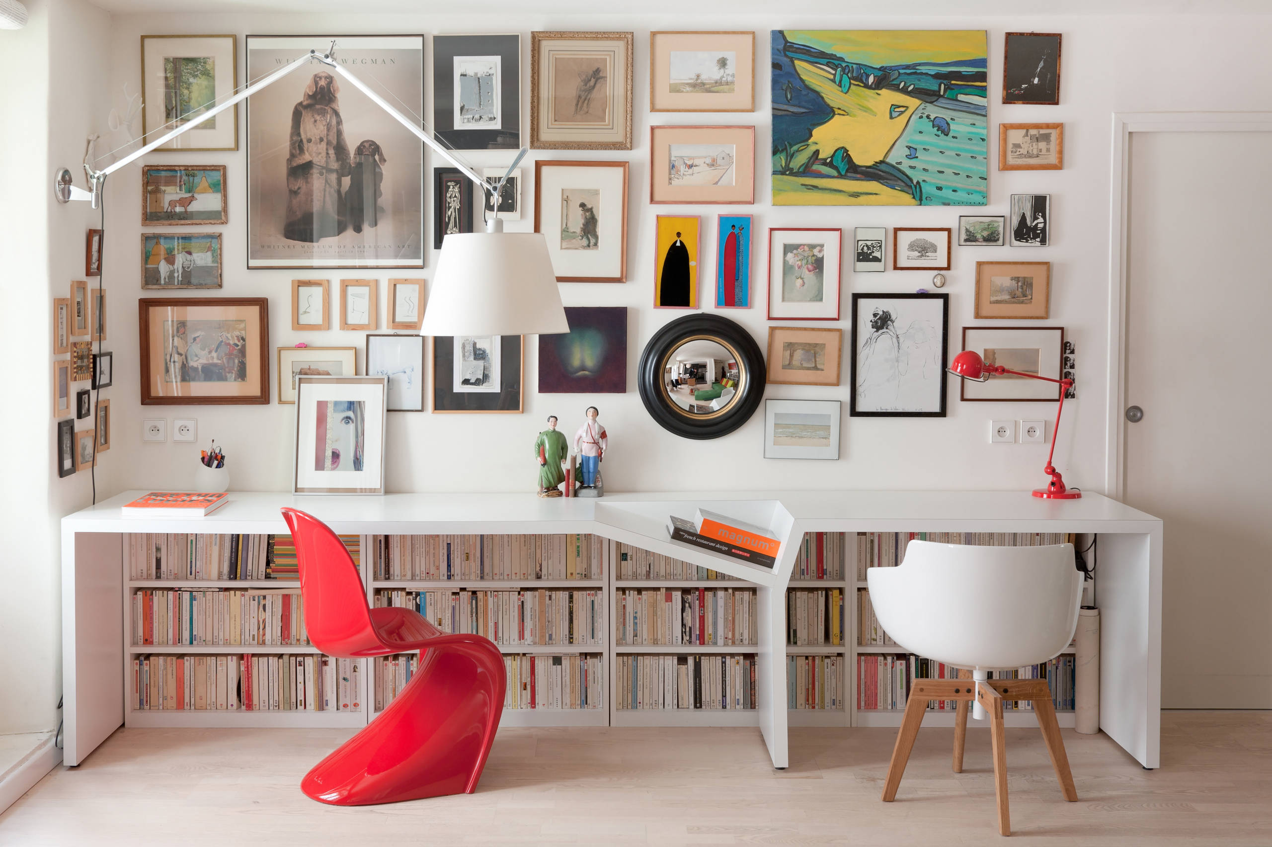 Das i-Tüpfelchen aber ist die Galeriewand. „Wir lieben Bilder und sind in den letzten Jahren zu Sammlern geworden. Um dem Arbeitsbereich eine persönliche Note zu verleihen und seine formale Strenge etwas abzumildern, erschien uns eine Galeriewand als perfekte Lösung“, so Christophe Vendel. Der bunte Mix aus Bildern in unterschiedlich großen Rahmen macht den besonderen Charme aus. Damit das Ganze nicht zu überladen wirkt, haben die Vendels die Rahmen farblich aufeinander abgestimmt und zum Rand hin ein paar Lücken gelassen.