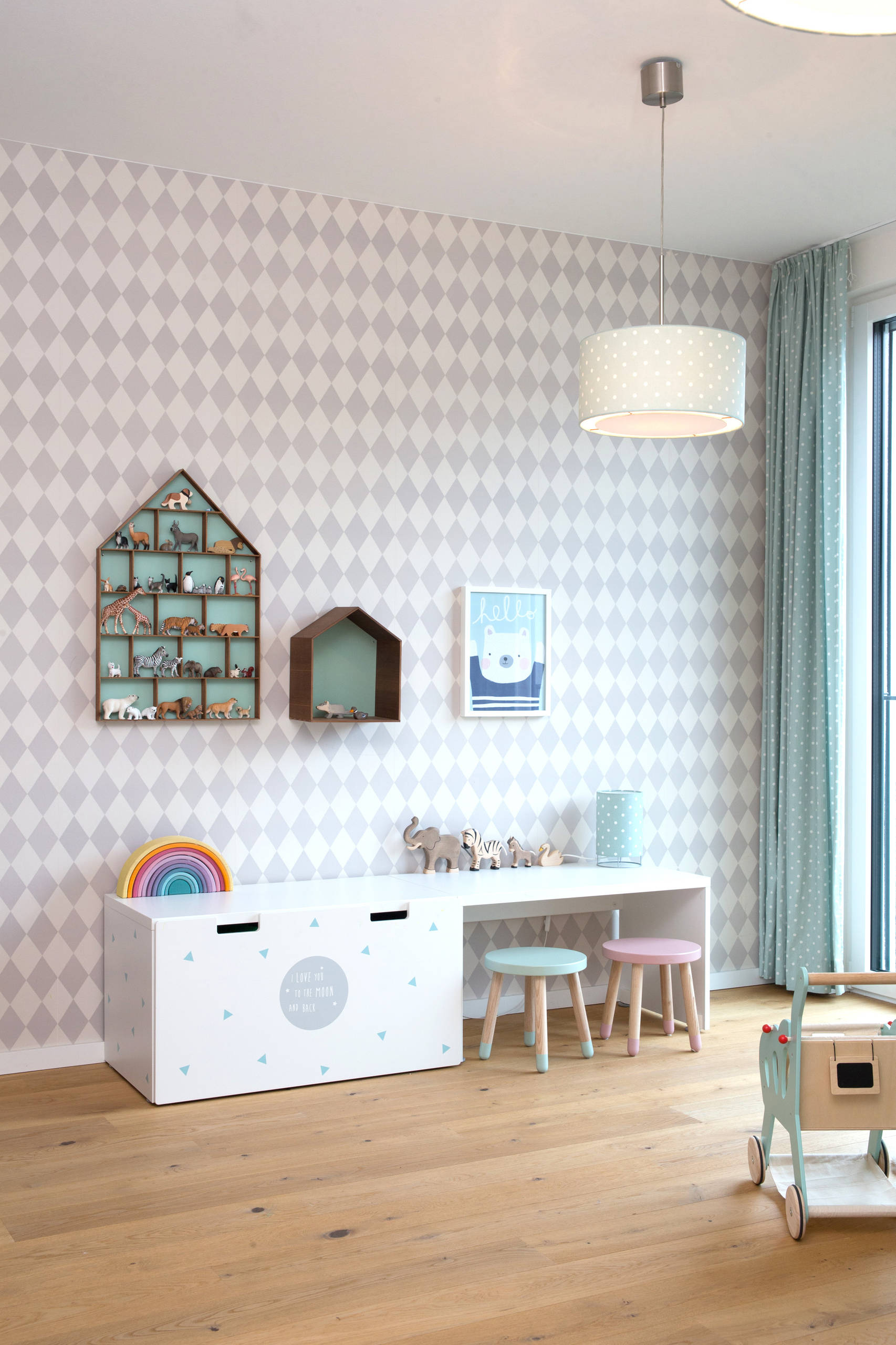 Die Lösung: Schätze sollten auch so präsentiert werden! Und das funktioniert mit dem guten alten Setzkasten am besten. Kindgerechte Wanddeko und Spielzoo in einem – so lautete die charmante Stauraum-Lösung von Kinderzimmer-Expertin Christine Hippelein von whatleoloves für dieses Spielzimmer in Pastellfarben.