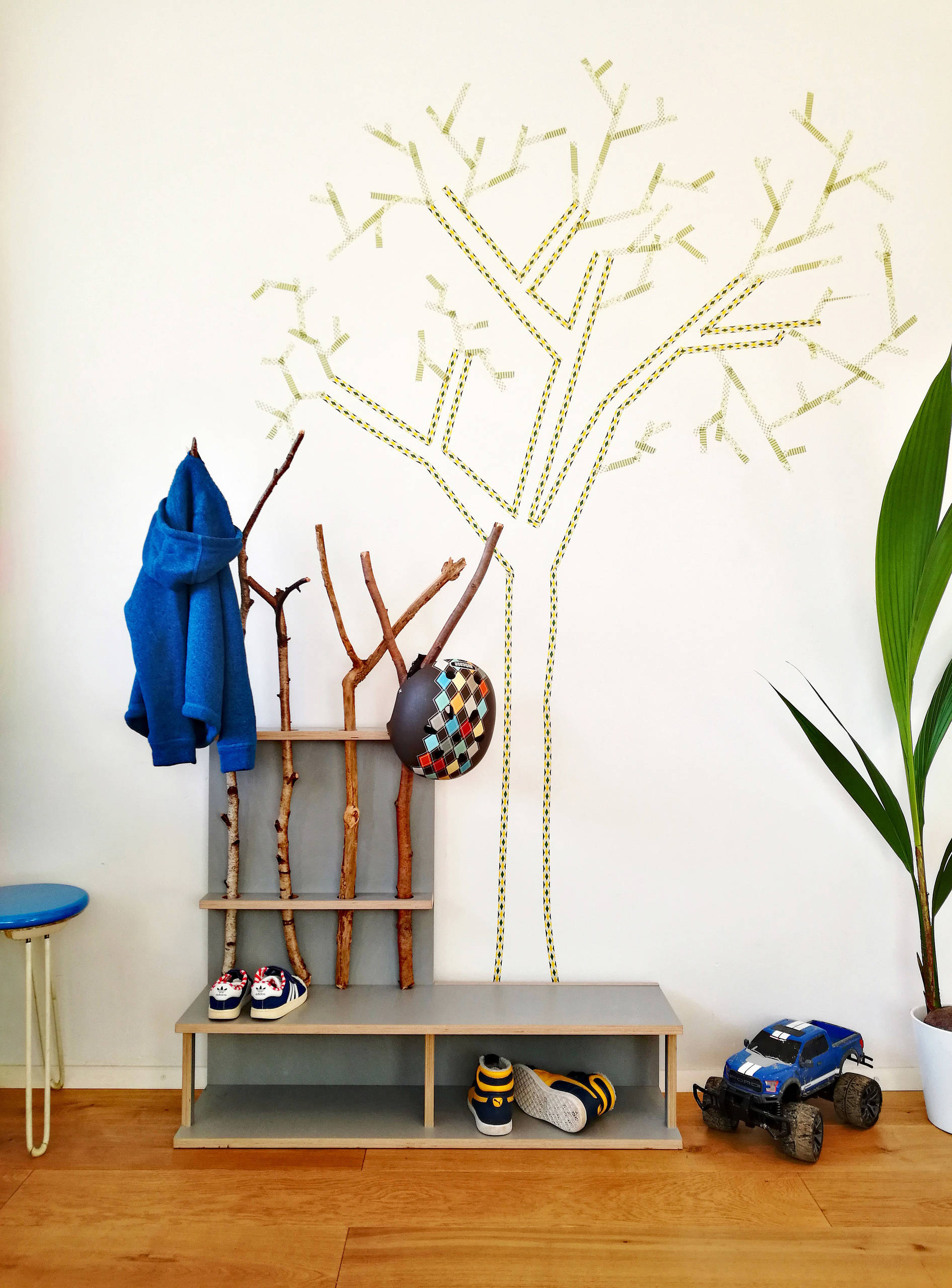 Die Lösung: Eine Handvoll Wandhaken dürfen in keinem Kinderzimmer fehlen, denn sie helfen dabei, Ordnung zu halten und Kleiderberge auf dem Boden gar nicht erst entstehen zu lassen. Mit ihrer Garderobe StammSitz machen Fnurst sich zudem die Sammelleidenschaft kleiner Entdecker zunutze: Die Stöcke dürfen selber ausgesucht und in die Löcher der Garderobe gesteckt werden.