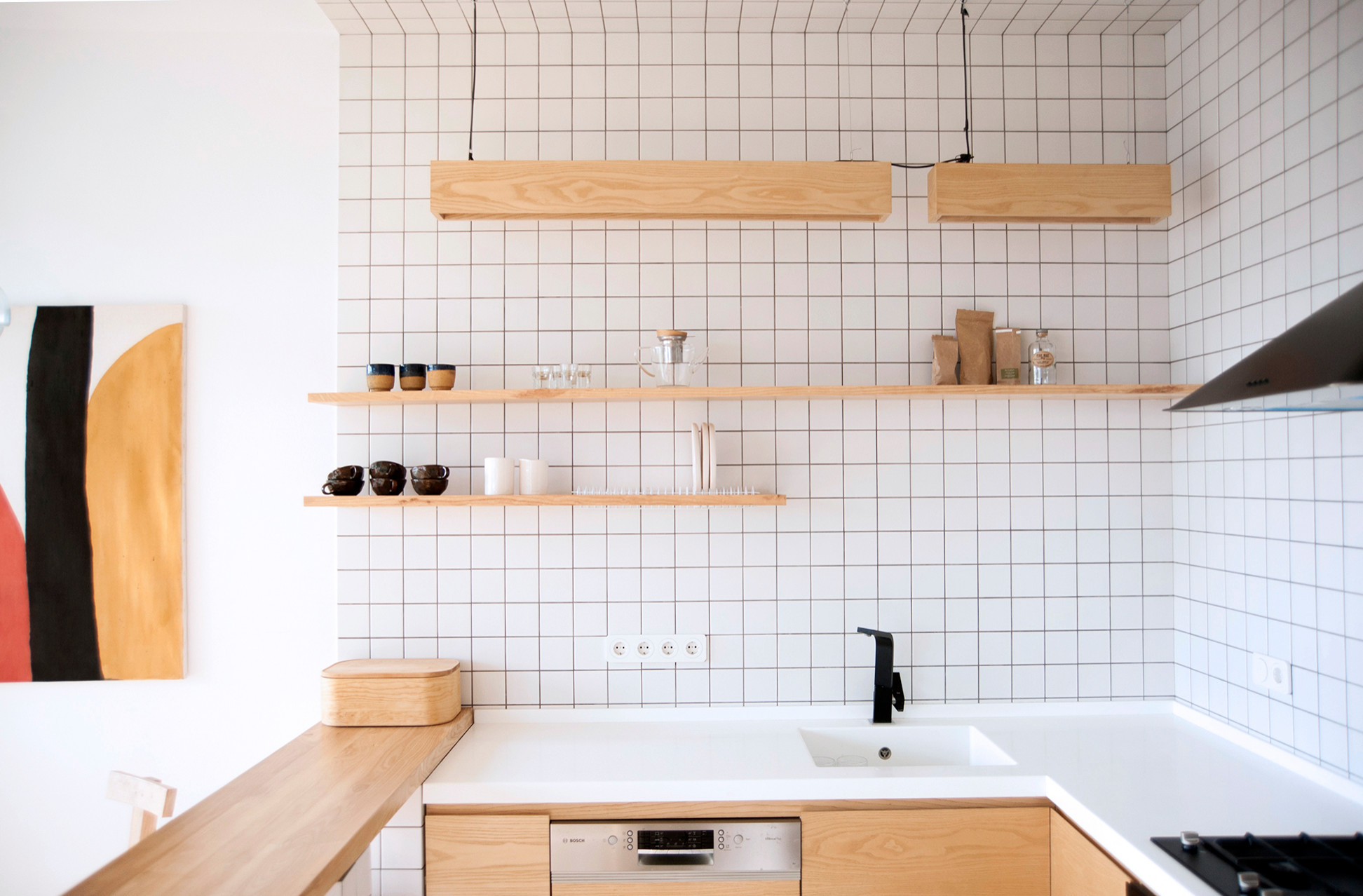 Ein leichter Gelbstich im Sperrholz sorgt in dieser kleinen offenen Küche eines Berliner Apartments für Gemütlichkeit und Wärme. Dem gegenüber steht ein vom Boden bis zur Decke verlaufendes Fliesenraster. Mit glänzend weißen Oberflächen bilden sie so gleich zweifach einen Kontrast zum warmen Holzton. Schwarze Akzente bieten dem Auge hier und da etwas Halt und lassen die Mischung noch lebendiger wirken. Eine unkomplizierte, lebhafte Mischung, auf die das Studio+- hier gesetzt hat.