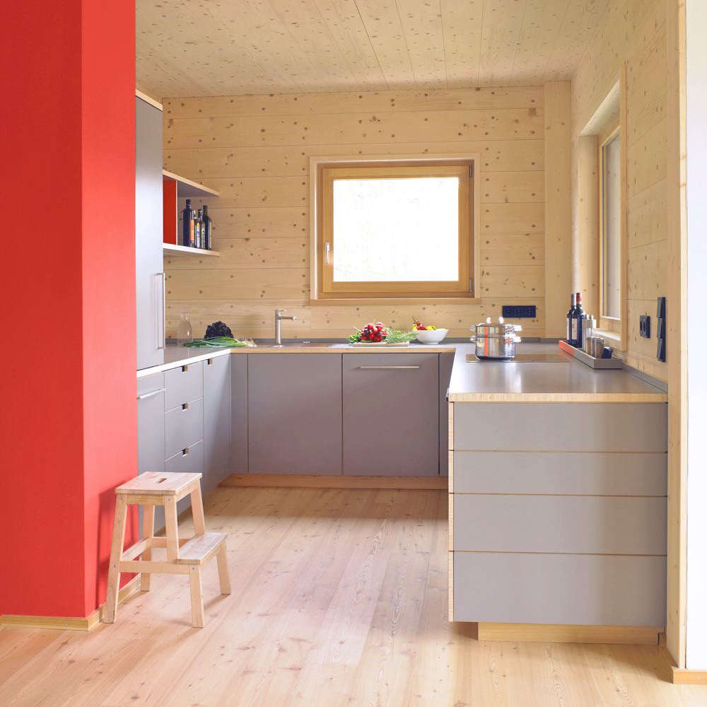 Ein Farbkontrast mit Signalwirkung setzte Leise Interior Design in diesem Münchener Einfamilienhaus mit einem leuchtend roten Wandvorsprung, der alle Blicke auf sich zieht. So dient das Rot, das in einem der dahinter liegenden Hängeschränke wiederholt wird, als Gegengewicht zu dem traditionell wirkenden, lebendig gemaserten Holz im Innenraum.