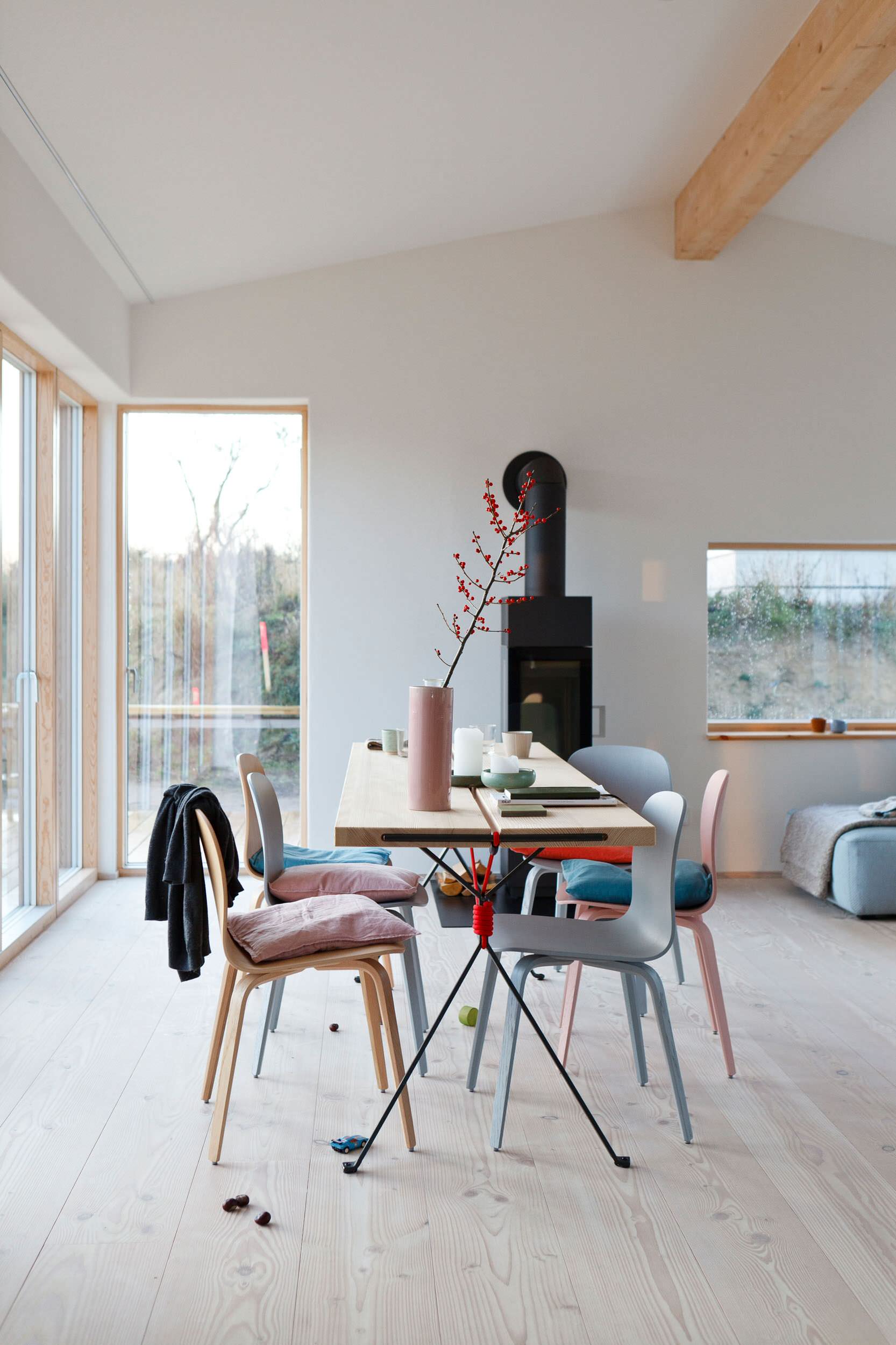 Das nicht immer der größtmögliche Kontrast auch das bestmögliche Ergebnis erzielt, zeigt sich anhand dieses von Studio Oink gestalteten Innenraums. Mit geweißten Dielen, pastellfarbenen Stühlen und einem hellblauen Sofa werden sanfte Töne angeschlagen und das Haus strahlt eine Gelassenheit aus, die ihresgleichen sucht. Einzig vereinzelte Farbtupfer in Rot und Blau bieten dem Auge Halt und sorgen für mehr Tiefe im Raum.