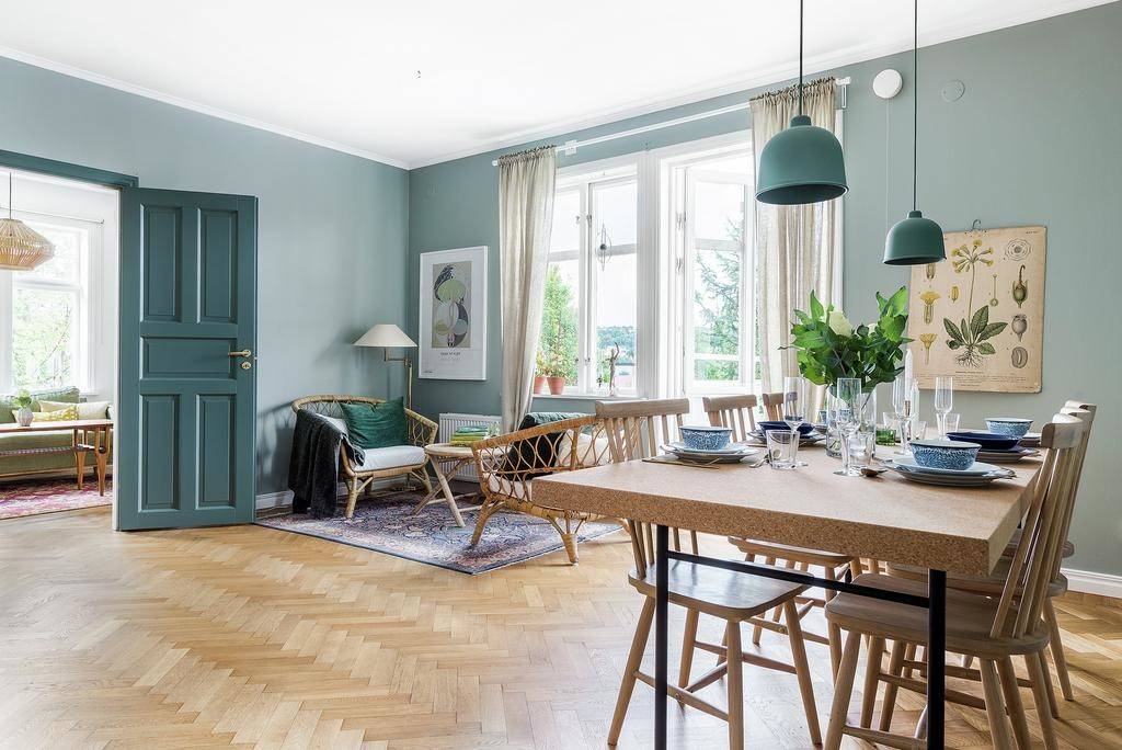 Einmal tief durchatmen, bitte! Blaugrau, auch bekannt als Taubenblau, erfrischt im Nu den Wohnraum, ohne dabei aufdringlich oder laut zu wirken. Mit viel hellem Holz entsteht ein modernes Ambiente im Skandi-Style. Besonders schön, weil perfekt aufeinander abgestimmt: Türblatt, Türrahmen und Leuchten sind in einer tieferen und klareren Farbnuance aus der gleichen Farbfamilie gestrichen.