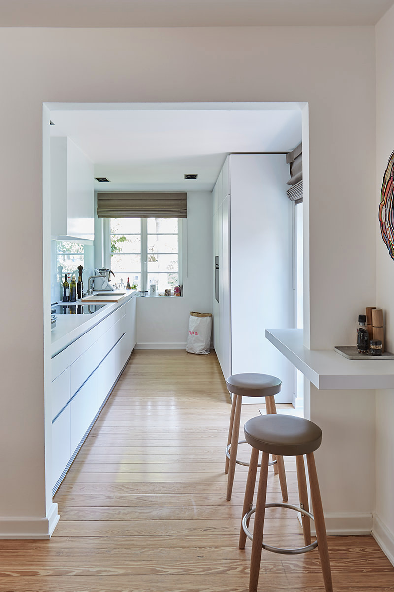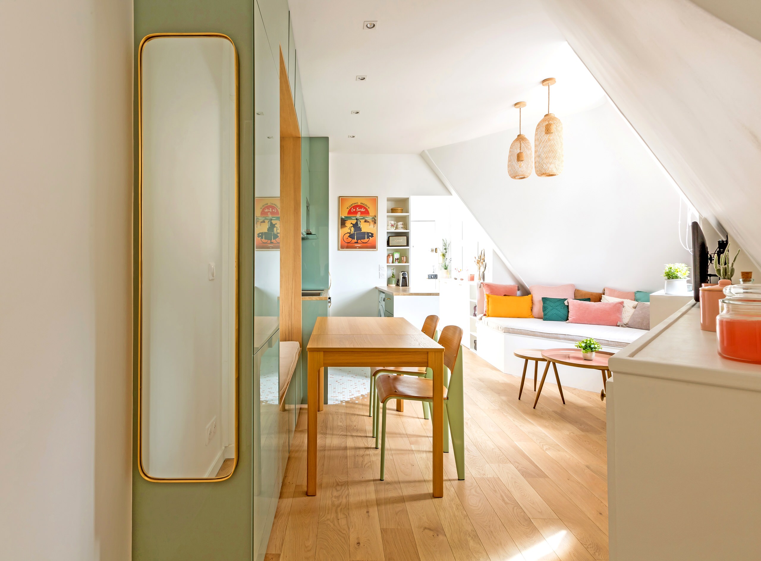 2. Essen im Regal. 30 Quadratmeter zum Wohnen, Kochen, Essen, Schlafen – auch diese Dachgeschosswohnung bot kein üppiges Platzangebot für einen separaten Essbereich. Um keinen Zentimeter zu vergeuden, ließen sich Neva Architecture Intérieure - Interior Design deshalb etwas Besonderes einfallen: Mit einer in die Schrankwand integrierten Sitzbank sparten sie so viel Platz ein, dass in dem schlauchartigen Raum sogar noch ein richtiger Esstisch hinein passte.