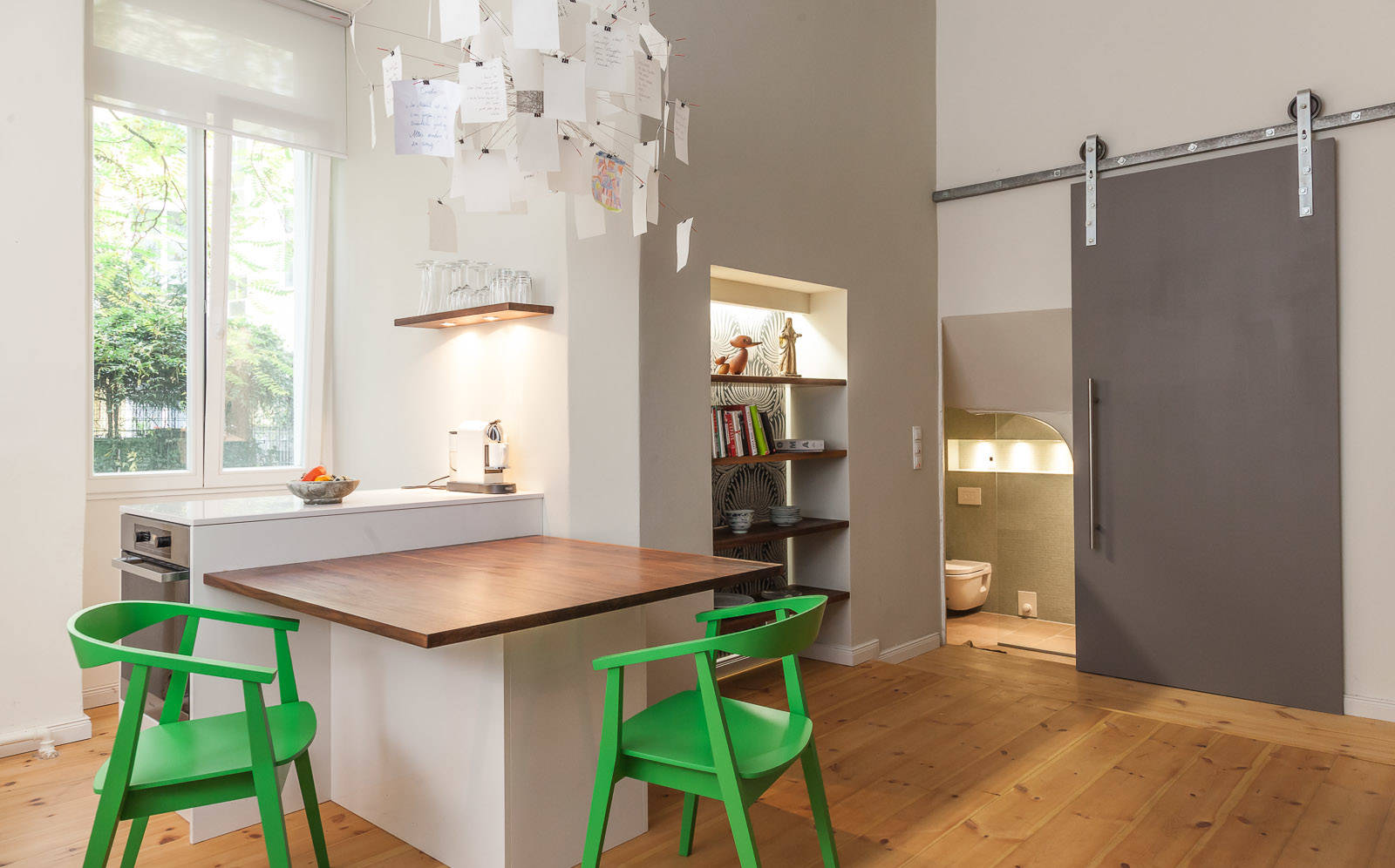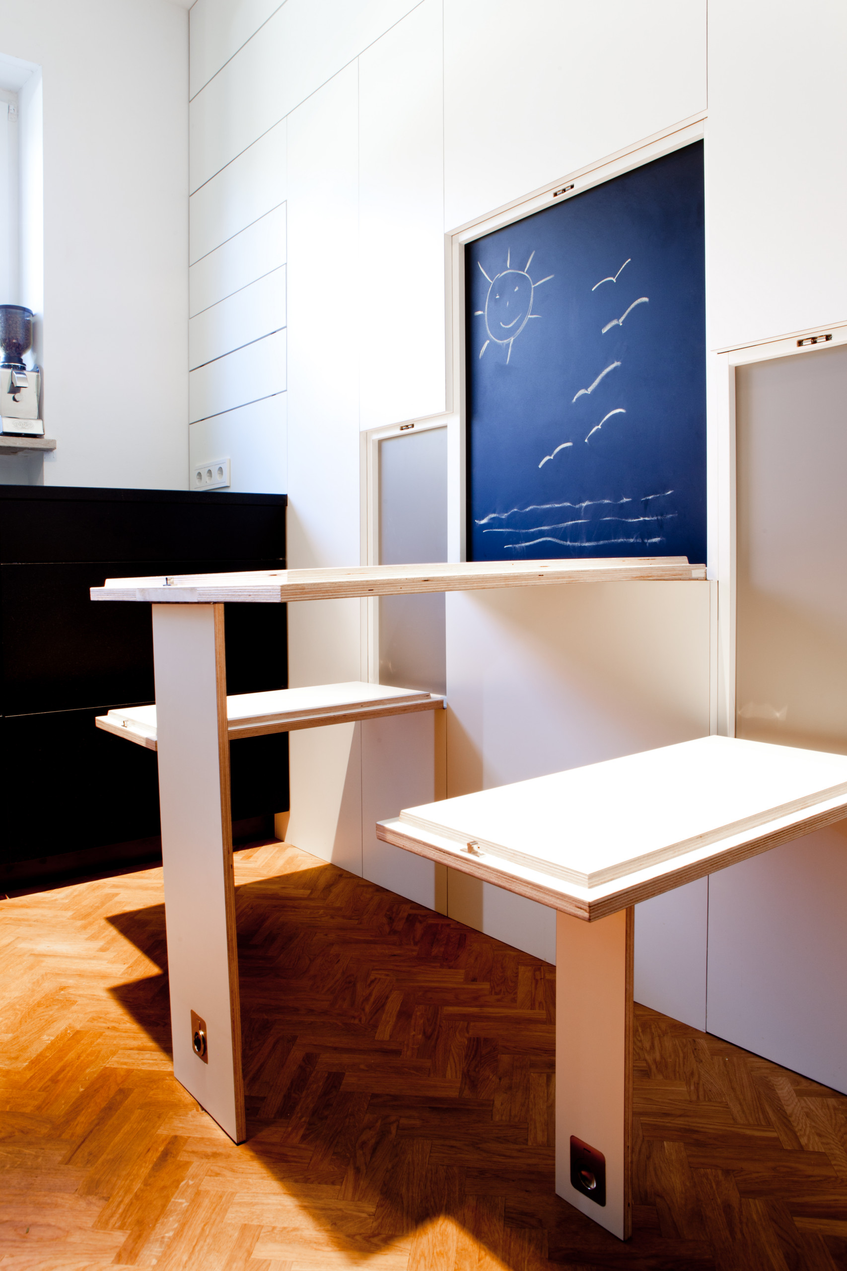 6. Ausgefahren. Besonders kreativ und minimalistisch mutet diese Lösung von Florian Bochard an, bei der der große Esstisch etwas eingeschoben unter der Küchenzeile auf seinen Einsatz wartet. Herausgezogen und um 90 Grad gedreht, bietet er einen großzügigen und zentralen Essplatz in dem Raum.