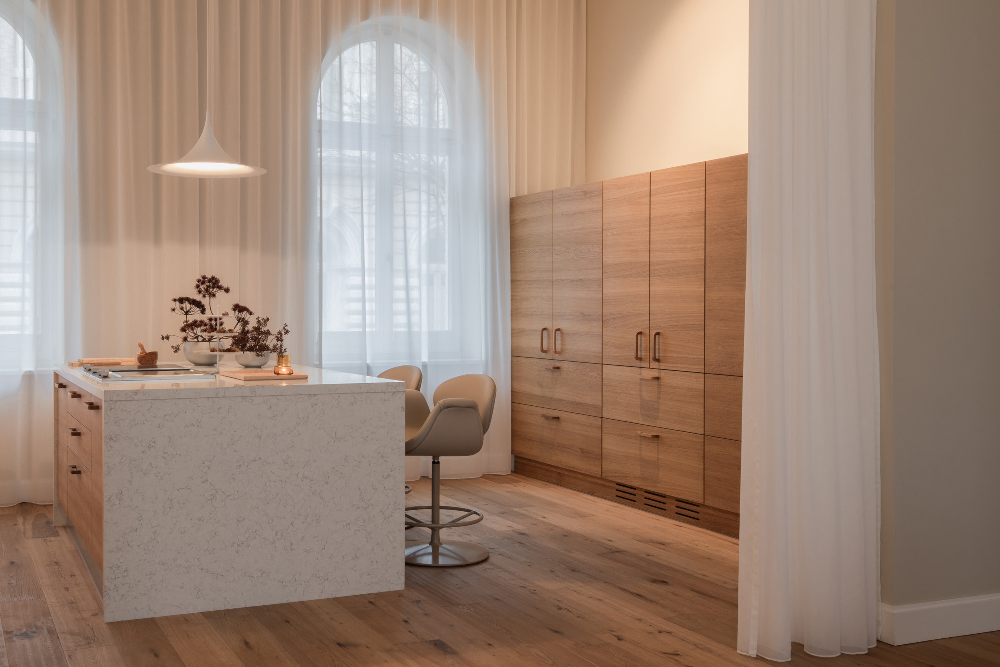 „Die großzügige Küche schließt sich an den offenen Wohnbereich an und ist hiervon durch einen leichten, transparenten Vorhang getrennt, der bei Bedarf geschlossen werden kann. Der massive Küchenblock in der Mitte bietet bequeme Sitzplätze für drei Personen. Durch die 4,5 Meter hohen Räume mit wunderschönen alten Rundbogenfenstern entsteht eine ganz besondere Atmosphäre.