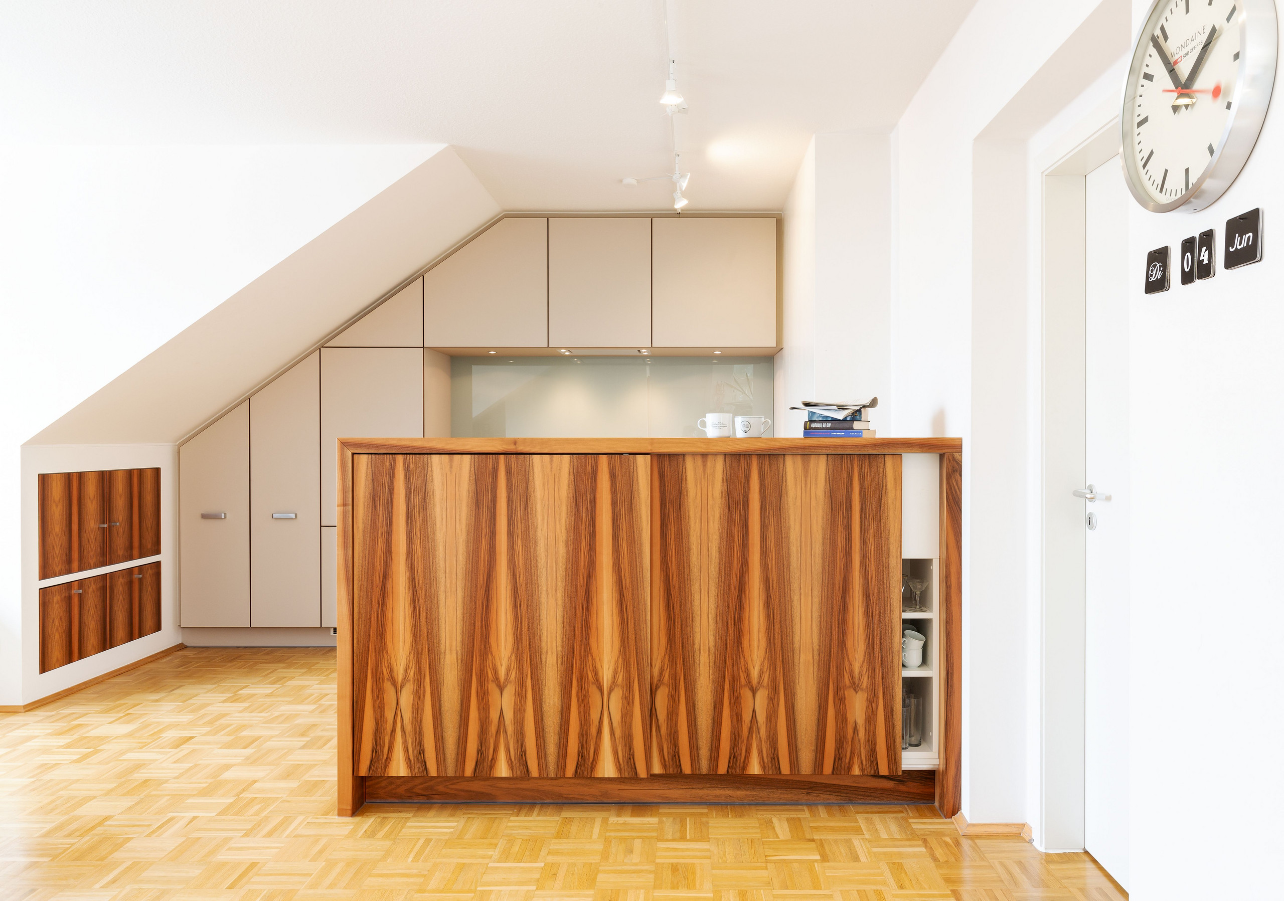 Was sich die Auftraggeber wünschten: Eine helle, offene, aufgeräumte und wirtschaftliche Raumsituation, die aber trotzdem Rückzugszonen bietet. Eine Küchenschranktür ist auch gleichzeitig der Zugang zu der sich dahinter befindenden Technik.