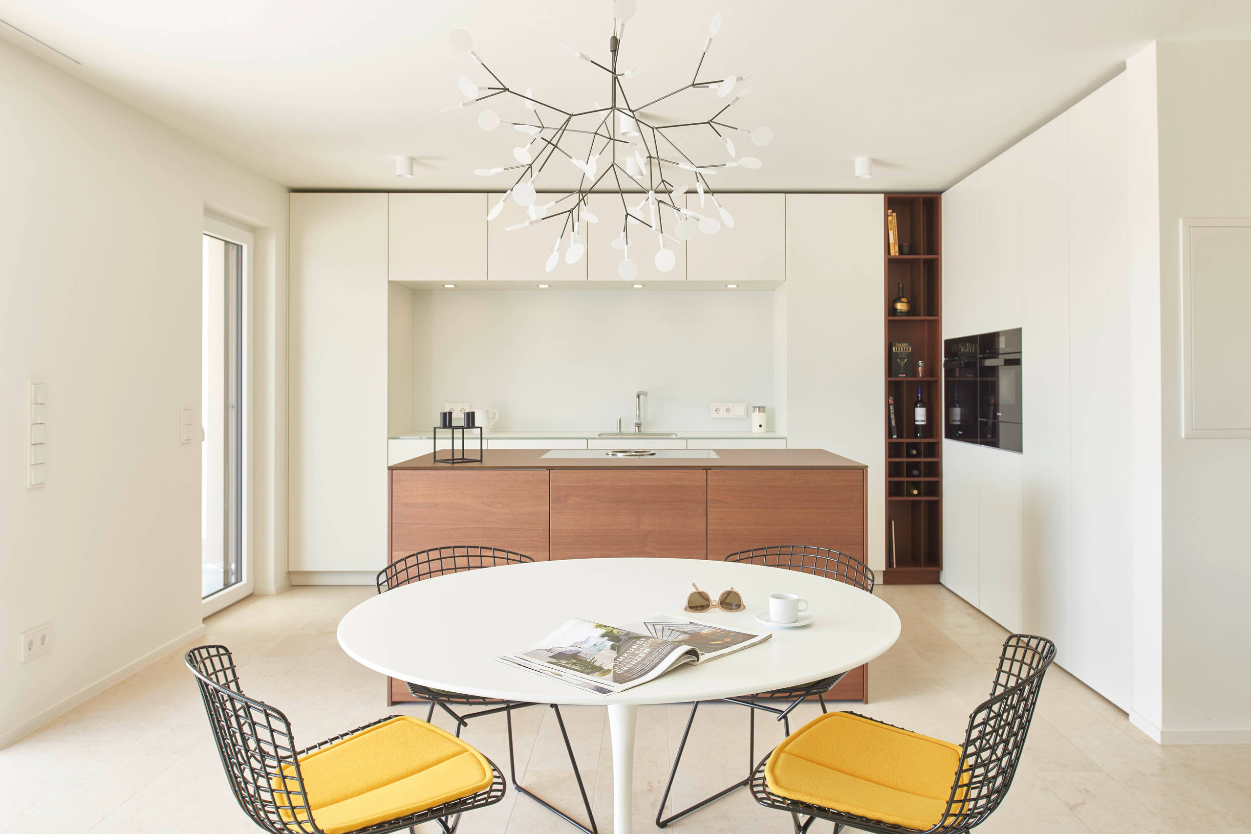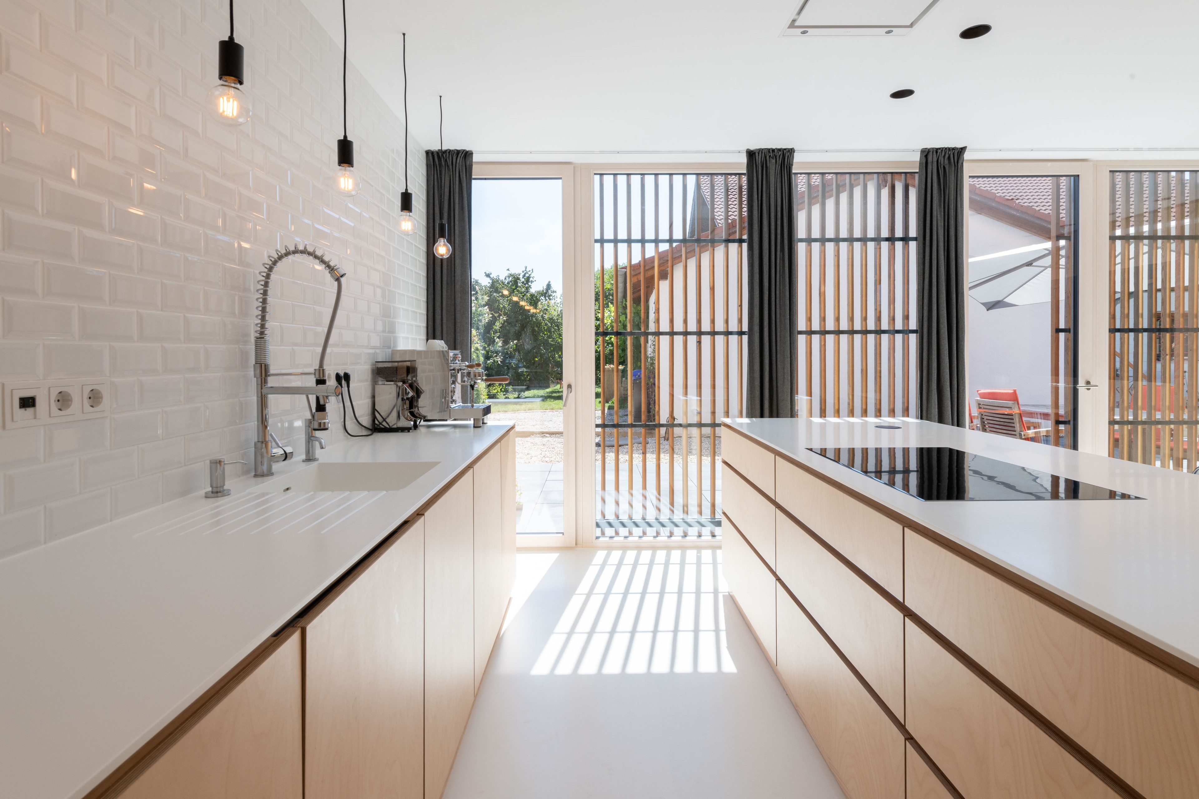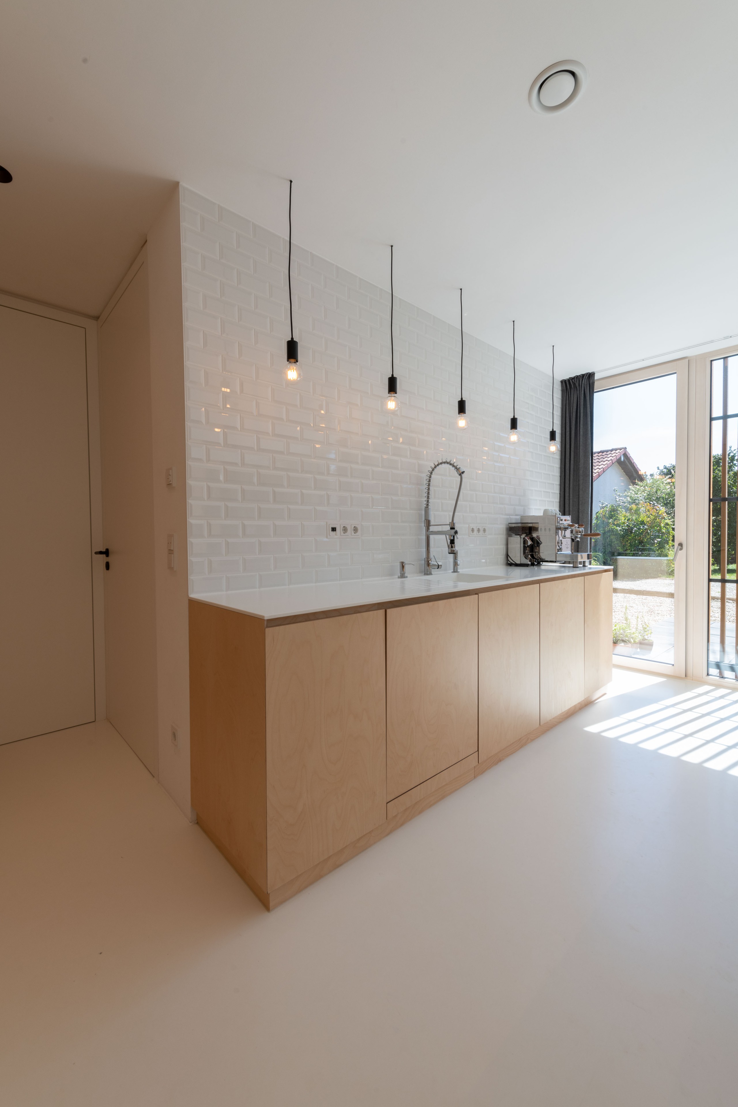 „Durch die helle Materialgestaltung und konsequente Umsetzung der Oberflächenstrukturen (die vertikalen Möbel sind aus Sperrholz in Birke, die horizontalen Flächen wie die Arbeitsflächen und der Boden sind in Weiß gehalten) sowie der aufgeräumten Gestaltung, wirkt der Raum trotz der kompakten Abmessungen sehr groß. Durch die weißen Oberflächen wird Licht in die Tiefe transportiert. Der Küchenschrank setzt sich im Wohnbereich, Garderobe und Treppe fort und ist gleichzeitig die Trennung zwischen Fluren und Aufenthaltsbereichen in einem durchdachten Grundriss“, sagt Robert Maier.