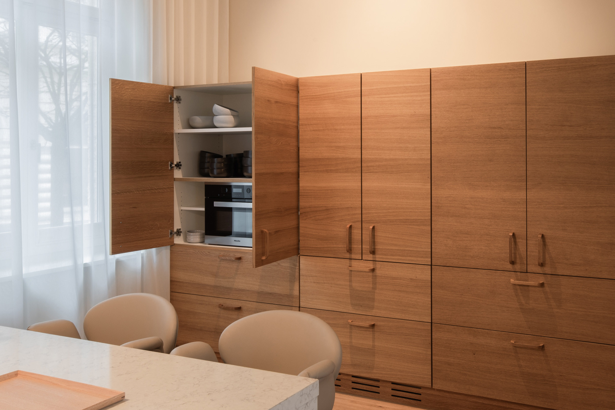 In den Einbauten an der rechten Seite wurden Kühl- und Gefrierschrank, Mikrowelle, eine Bar und viel Stauraum integriert. Auf Oberschränke an der linken Seite konnte durch den vielen Stauraum verzichtet werden, was die Küche leicht und elegant wirken lässt“, sagt Constanze Ladner.