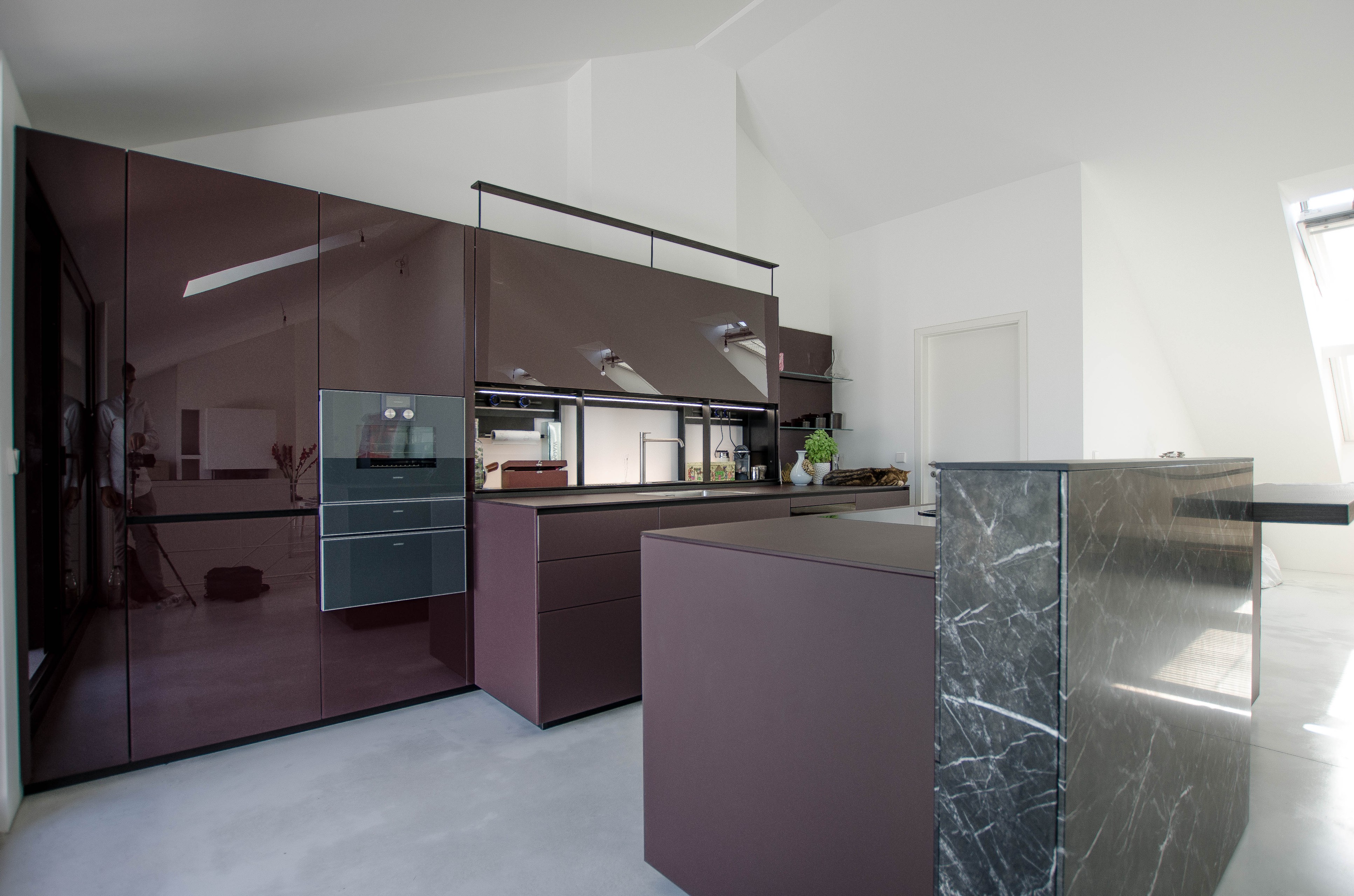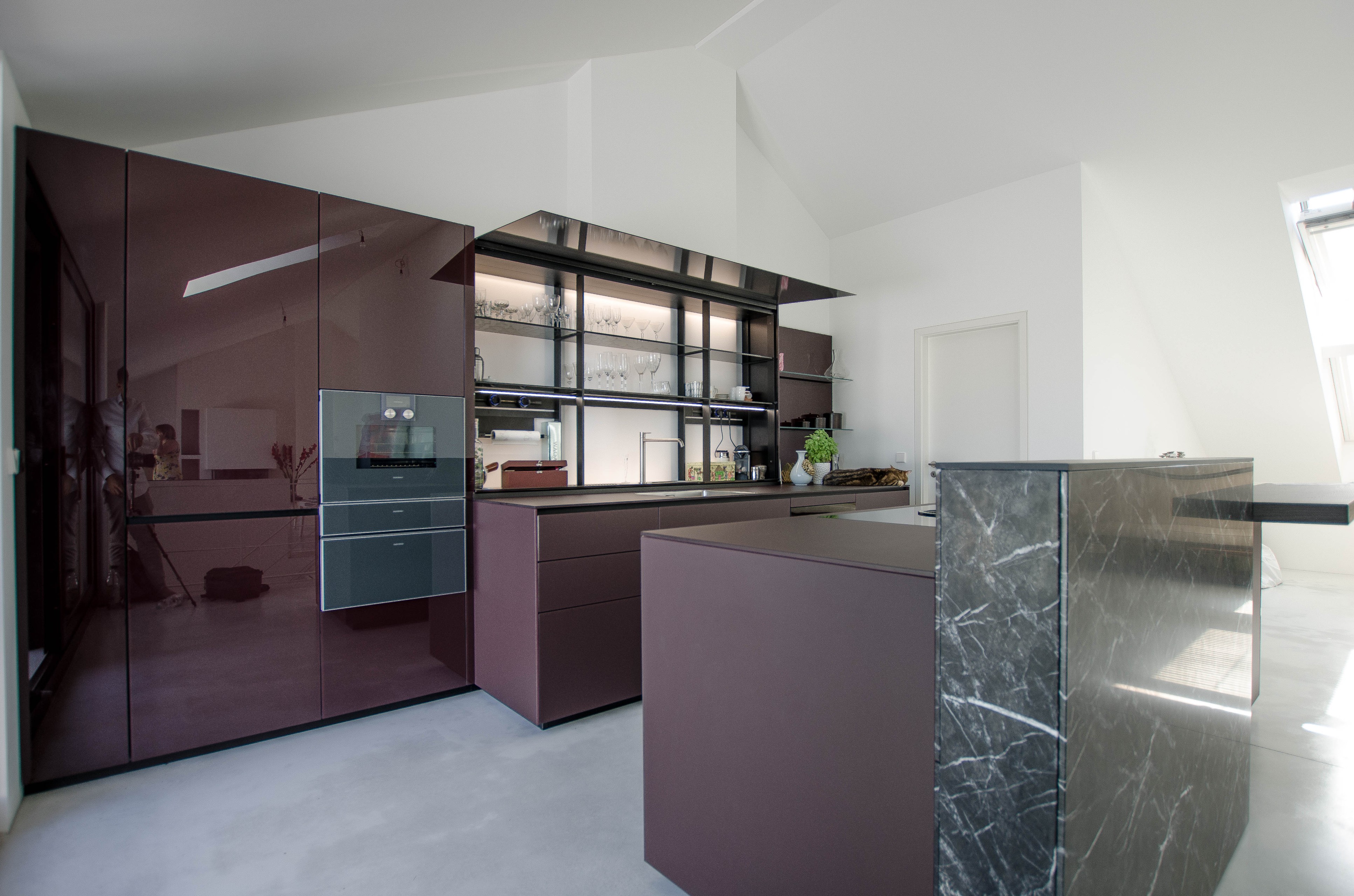 „Ein in den Drempel integriertes Schubladenelement, das nun wie ein Gebäudeteil wirkt. Oberschränke so tief wie Unterschränke, was einen blockartigen Charakter erzeugt und die Materialauswahl. Weiter das Fugenbild und die umlaufende, zurückspringende gleich breite Passblende der Küchenzeile“, sagt Sebastian Köhler.