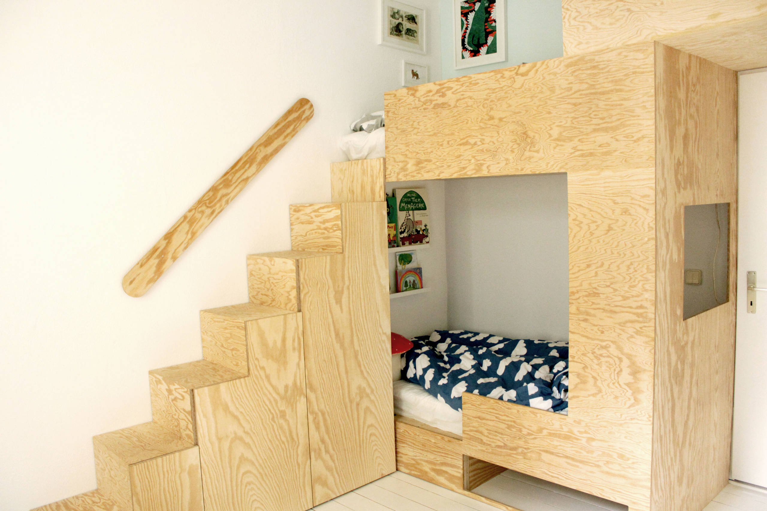 Architektin Friederike Grotheer empfiehlt, für ein Hochbett Leitern zu nutzen, die nicht steil sind. Oder alternative Treppenlösungen: „Eine Treppe als Teil eines Einbauschranks ist praktisch und eignet sich wegen der Sicherheitsaspekte für den täglichen Gebrauch.“ Vor allem, wenn das Hochbett nicht nur zum Schlafen abends genutzt wird, kann eine Leiter zu einer Gefahrenquelle werden, meint auch Sina Gwosdzik: „Wenn Kinder nachts auf Toilette müssen, bietet sich eher eine Treppe an, am besten mit Griffen oder einem Geländer.“ DIN EN 747 empfiehlt bei Kinderhochbetten eine Leiter, die fest mit dem Bett verbunden ist.