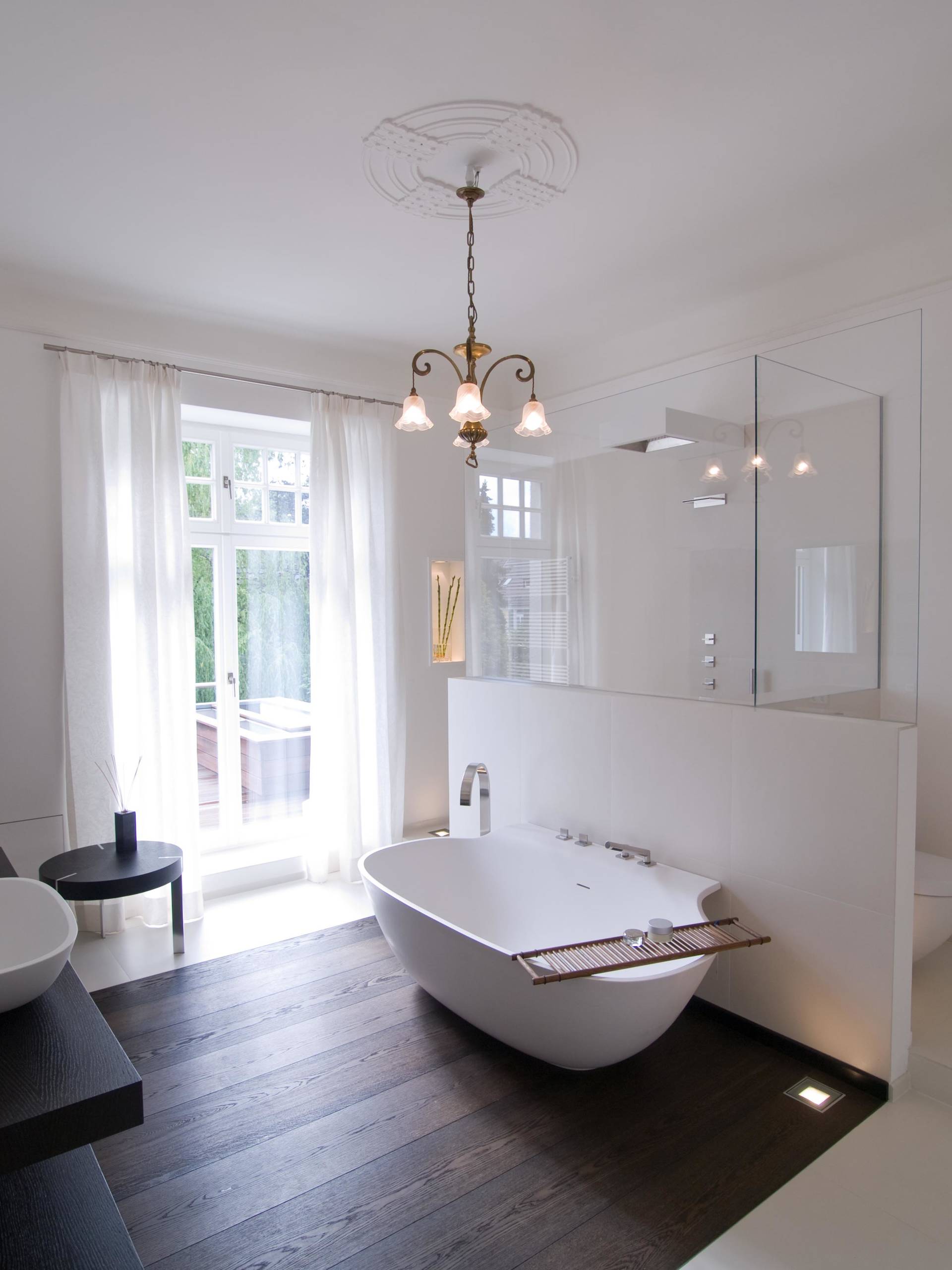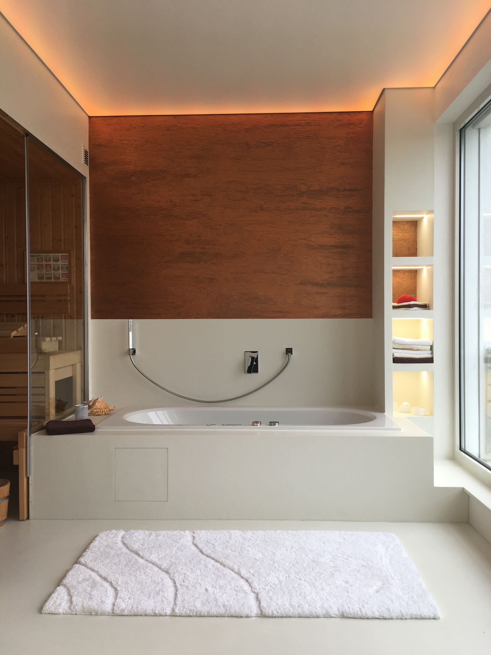 - Badewanne: von Bette, Armatur mit Thermostat von der Firma Hans Grohe. Die Wannenverkleidung besteht aus Keramikplatten von Neolith. Im Wannen-Sockel wurde eine indirekte LED-Beleuchtung angebracht.