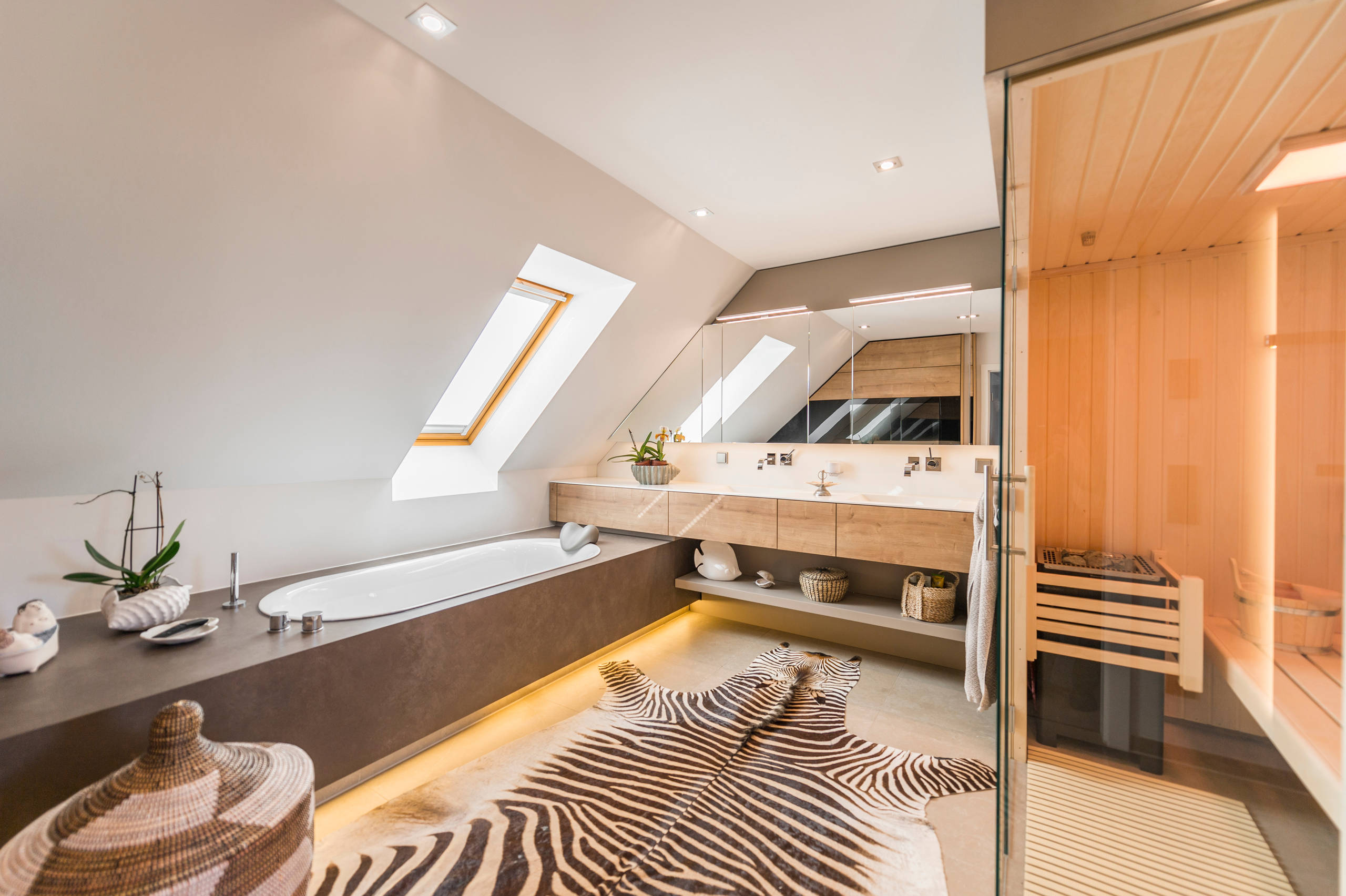 - Möbel und Waschtische: Geplant und maßgefertigt vom Schreiner. Der Wunsch der Bauherren nach viel Stauraum wurde umgesetzt, indem die Dachschrägen in die Planung integriert wurden. Die Doppelwaschtische samt Rückwand bestehen aus einem sog. HiMax-Material in Alpinweiß. Armaturen von Hansgrohe sowie Dornbracht.