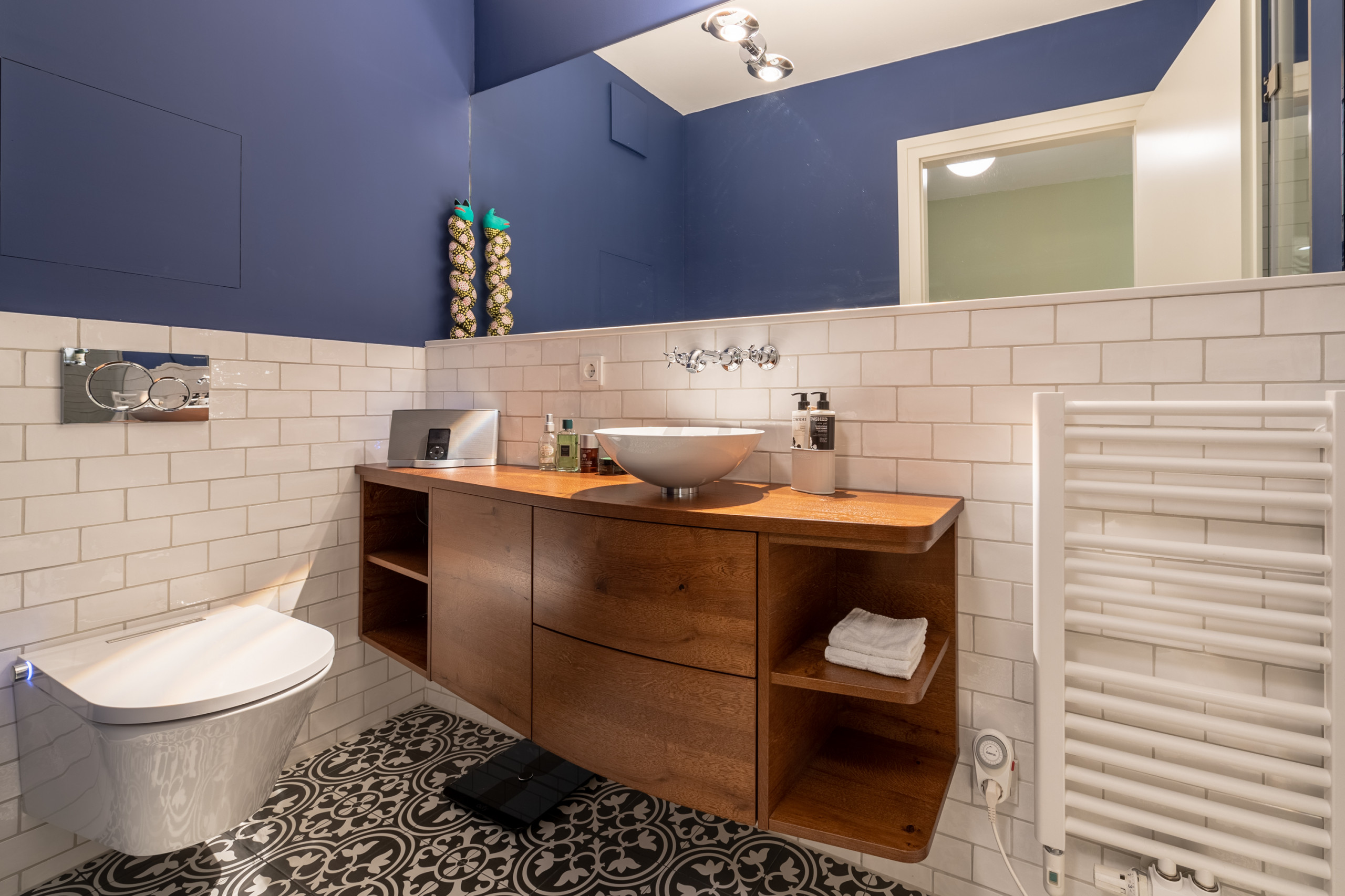 - Soundsystem: In die Trockenbau-Decke wurde ein unsichtbares, flächenbündiges Lautsprecher-System der Firma PurSonic integriert. Steuergerät von Sonos. Besonderheit: Bei Betreten des Bads schaltet sich Musik ein.
